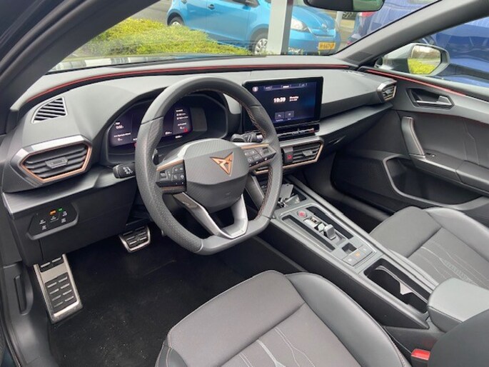 In één oogopslag zijn alle vitale functies afleesbaar dankzij het digitale dashboard. Ook achter de auto geen verrassingen bij het inparkeren. Daarvoor zorgt de achteruitrijcamera. Adaptive cruise control houdt de ingestelde snelheid vast en houdt afstand tot het voertuig voor je. De ingebouwde file assistent is een echte helper als het vaststaat onderweg. Het systeem meet ruimte tot de auto vóór u permanent en activeert zelfs de remmen als je voorligger stopt. Oliepeil, bandenspanning, sloten en andere functies zijn via een speciale app overal te checken dankzij Connected Services. Je bent in deze CUPRA ook voorzien van dashboard met spraakbediening, full map navigatiesysteem, WIFI-hotspot, achteropkomend verkeer waarschuwing, electronic climate control en schakelpaddles aan het stuur.