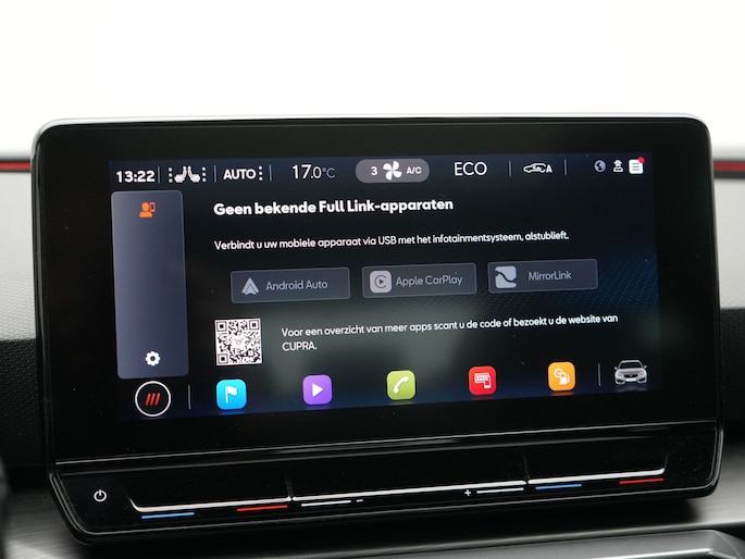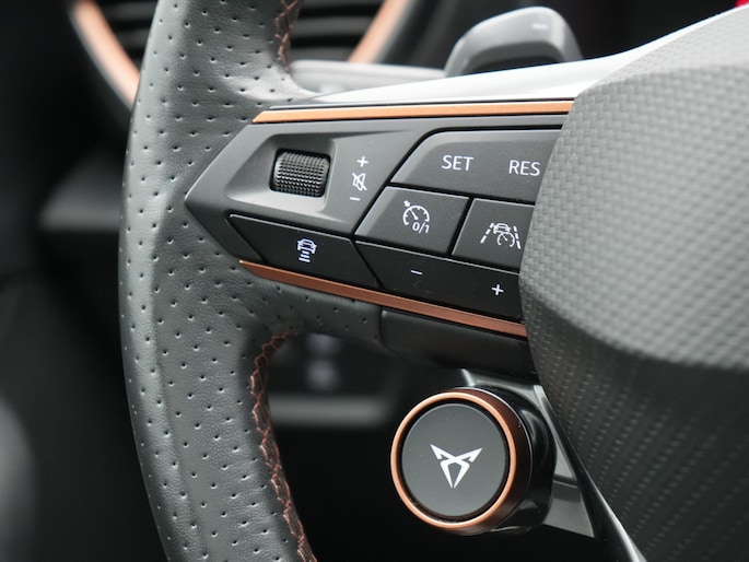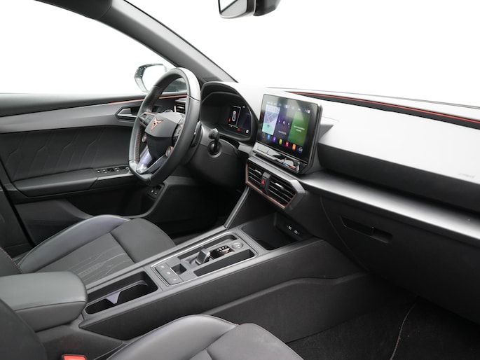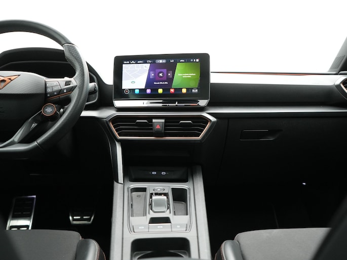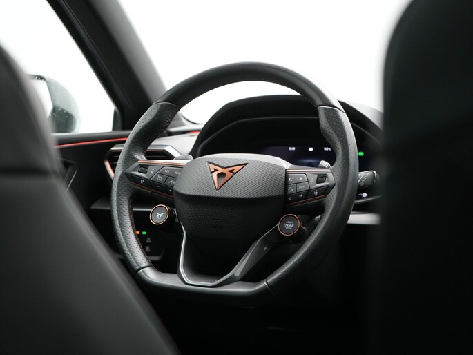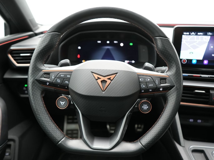 Ervaar de wonderen van de digitale mobiliteitswereld waarbij alles wat u wenst op het digitale dashboard verschijnt. Met adaptive cruise control houdt de auto zelfstandig afstand tot uw voorligger. Een veiligheidsverhogende optie waarmee u comfortabel onderweg bent. Loopt het verkeer onderweg vast, schakel dan de file assistent in en laat het systeem zorgen voor de juiste afstand bij stilstaan en rijden. In het zeldzame geval van een storing weet u nog eerder dan de monteur wat er mankeert. Uw smartphone met remote services geeft direct inzicht. De bediening van het audiosysteem en het navigatiesysteem gebeurt met knoppen op het stuur en als u wilt zelfs met uw stem. De audio is overigens voorzien van DAB-radio voor een altijd heldere ontvangst. Ook is de CUPRA uitgerust met: WIFI-hotspot, electronic climate control, draadloos opladen, parkeersensoren voor en achter, regensensor en keyless entry.