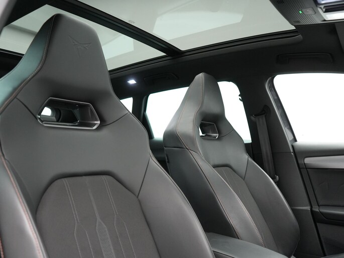 Handig, zo'n hatchback. Aan de achterzijde een extra deur, om makkelijk in en uit te laden. De hybride motor combineert het gebruik van brandstof en elektriciteit, en dat maakt van deze CUPRA Leon een zuinige, slimme auto. Stijl en comfort krijg je erbij in de vorm van een fraai lederen interieur. U past de stoelen moeiteloos aan, ze zijn elektrisch in te stellen en hebben bovendien een geheugen. Het interieur baadt in daglicht dankzij het elektrisch bediende glazen panoramadak. Een verwarmd stuurwiel overbodige luxe? Wacht maar tot het kouder wordt! Ook 19 inch lichtmetalen velgen, LED koplampen, adaptief dempingsysteem, zwarte hemelbekleding, donker getint glas achter en in delen neerklapbare achterbank zijn aan boord.