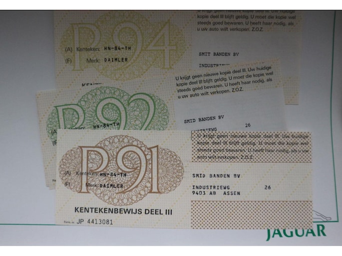 Origineel Nederlands geleverde Jaguar Daimler 4.2 Sovereign van 1982 in sublieme conditie met origineel slechts 45.383 kilometers met Nationale Autopas. De auto is in 1982 nieuw verkocht door autobedrijf Misker uit Emmen aan de eerste eigenaar uit Assen. Bij de auto is een kopie van de originele afleverbon waarop dit vermeld staat. De nieuwprijs in 1982 bedroeg 83.000 gulden.