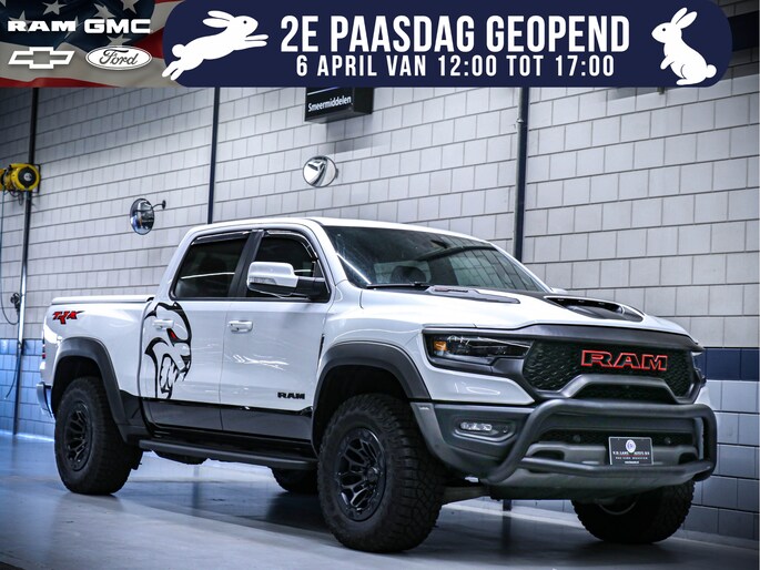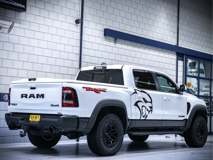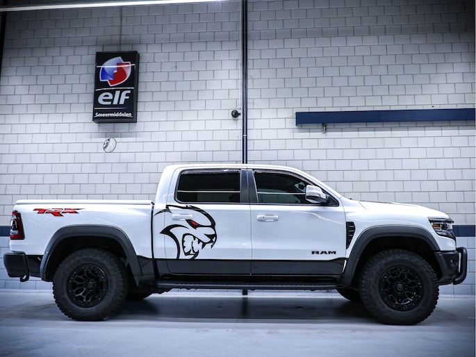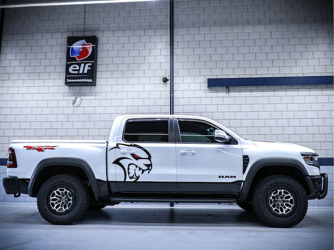 De heldere witte kleur geeft de pickup een frisse en moderne look. De robuuste bouw en stoere details maken deze Ram 1500 TRX een echte blikvanger op de weg.