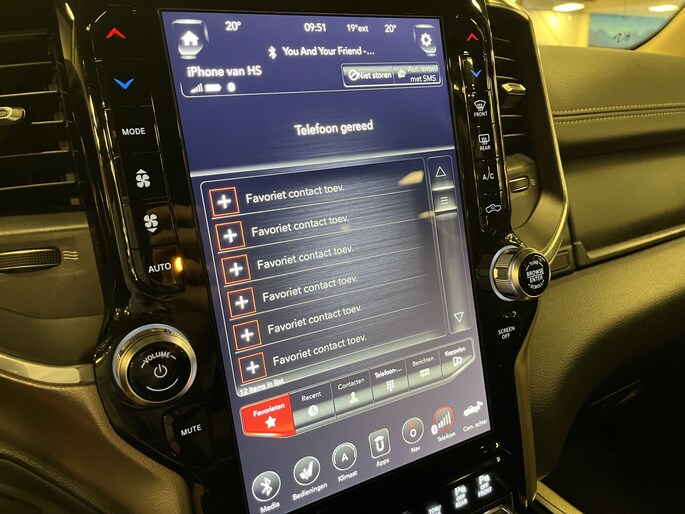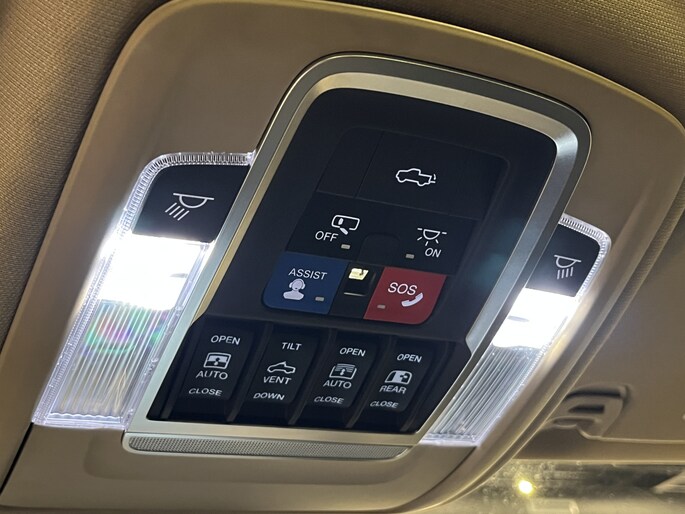 Overige uitrusting: Afstand start systeem, Uconnect Europees navigatiesysteem met stembesturing en 12inch (30,5cm) display, Harman/kardon 19-speaker audio-systeem met CD-Speler, AUX, USB en haaienvin antenne, draadloos oplaadsysteem voor mobiele telefoons, regensensor, verwarmd stuurwiel, voorstoelen met verwarming en koeling, High Beam Control (automatisch dimmend grootlicht bij naderend verkeer), LED-Mistlampen, LED-Koplampen, LED-Achterlichten, LED-Interieurverlichting, parkeersensoren voor- en achter, zithoek achterbank verstelbaar, keyless go, licht- en regensensor, automatisch dimmende binnenspiegel, middenconsole met groot opbergvak, extra opbergvakken onder de achterbank, dubbele uitlaat met RVS uitlaatsierstukken, achterste zijramen en achterruit donker getint (Privacy Glass).