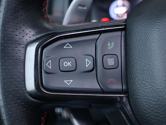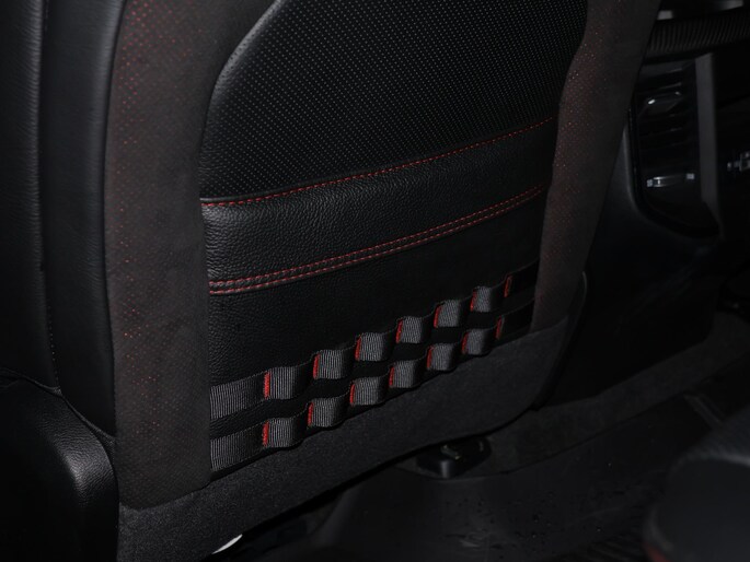 Het interieur is een perfecte balans tussen sportiviteit en luxe. De TRX-sportstoelen met contrasterende rode accenten, het panoramadak en het grote centrale touchscreen creëren een indrukwekkende cockpit. Het Harman Kardon audiosysteem zorgt voor een krachtige geluidsbeleving, terwijl navigatie, Apple CarPlay en Android Auto alles bieden wat je van een moderne topuitvoering mag verwachten. Elk detail ademt performance, zonder het comfort uit het oog te verliezen.