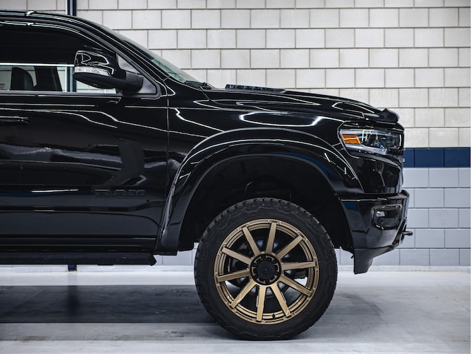 Zodra je hem ziet, valt het totaalplaatje meteen op! De custom XD velgen zijn gepoedercoat en lopen perfect over in de bijpassende striping, wat ’m een dikke, strakke uitstraling geeft, zelfs de sleepogen zijn mee ge-poedercoat in kleur. De 4 inch BDS liftkit zorgt ervoor dat hij lekker hoog staat en precies die brute houding heeft die je van een Ram verwacht. Aan de voorkant zit een bugshield die de lak beschermt tegen steenslag en insecten, en met de raamkappen oogt hij niet alleen stoerder, maar zijn ze ook gewoon praktisch.