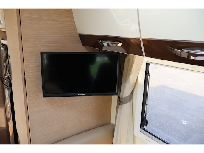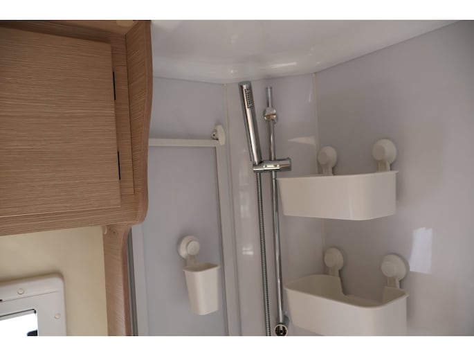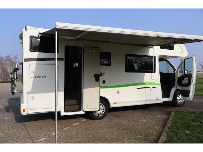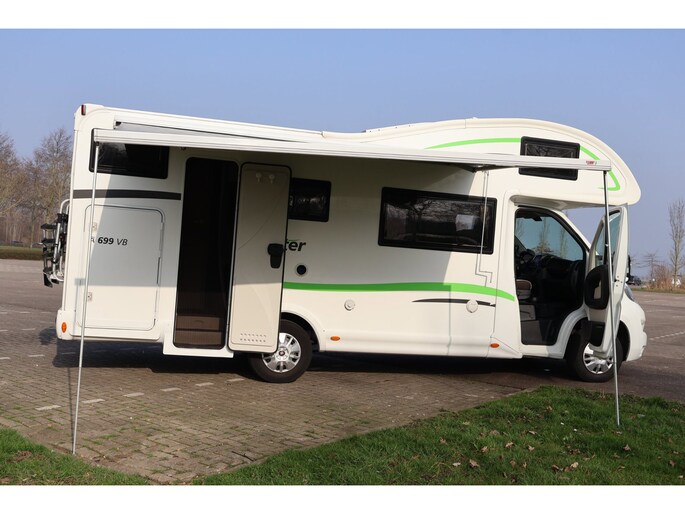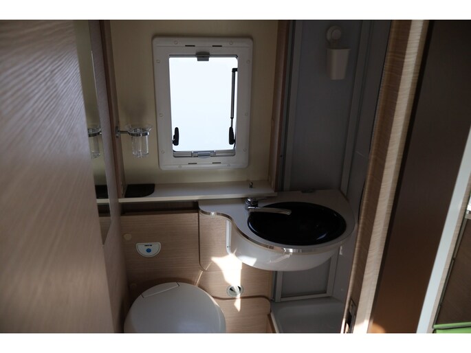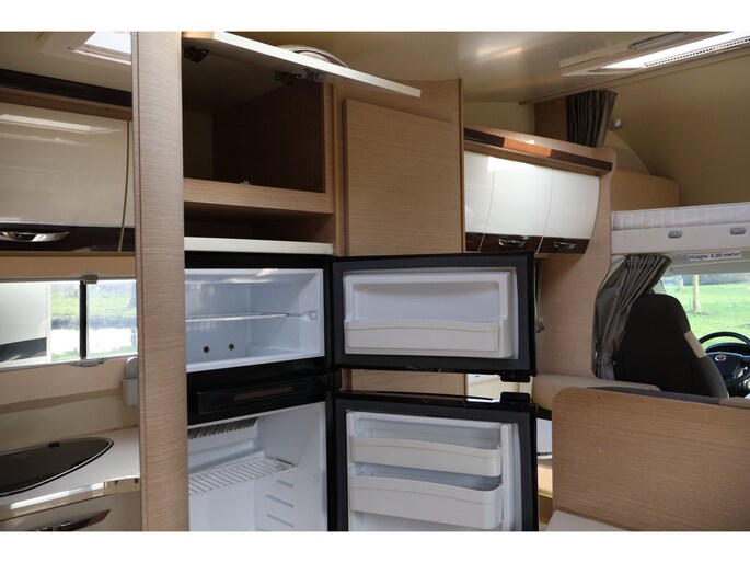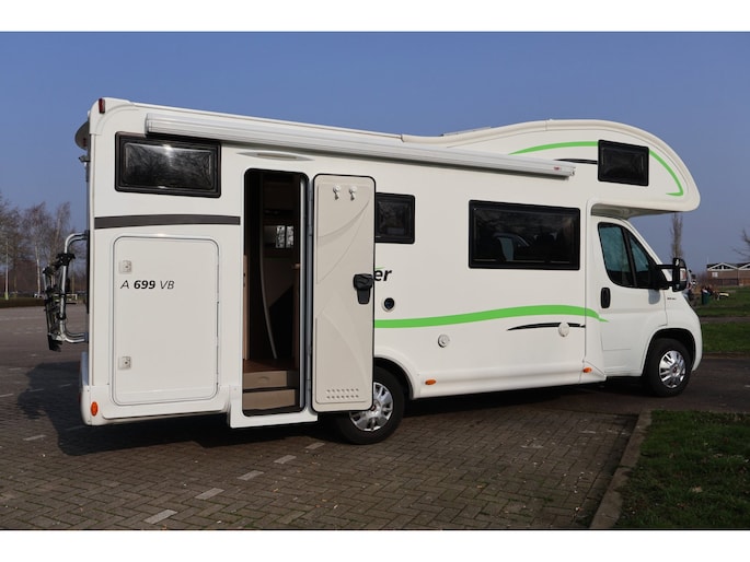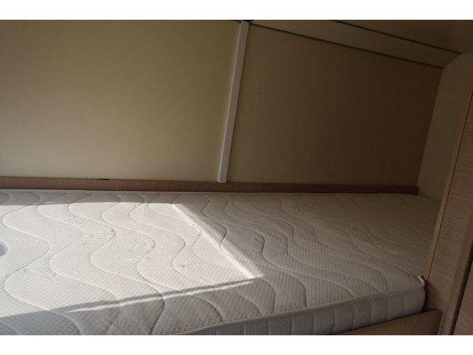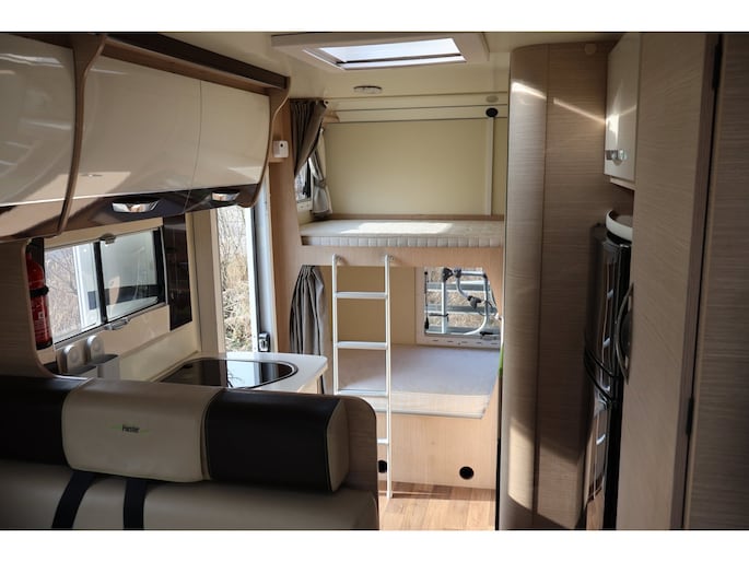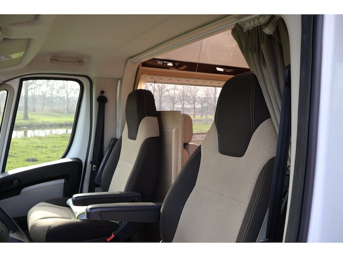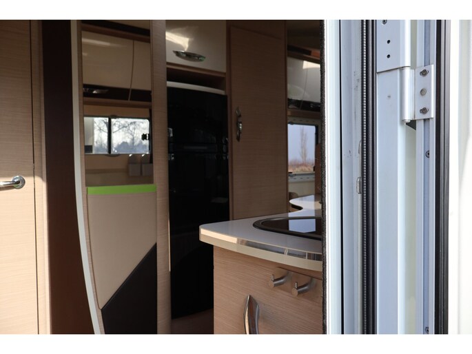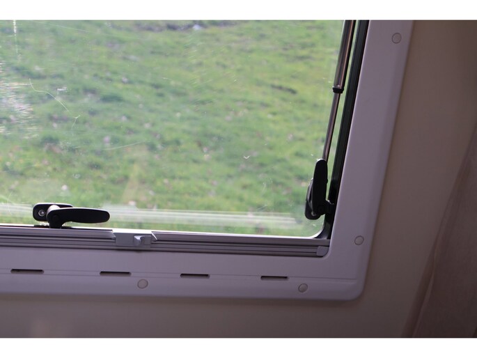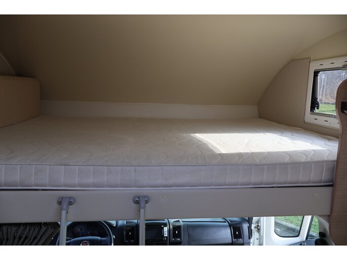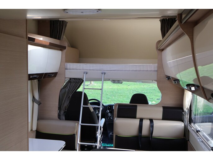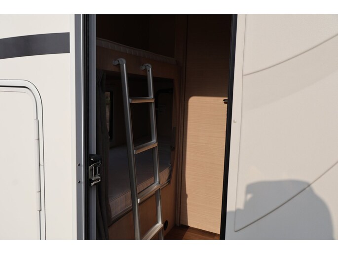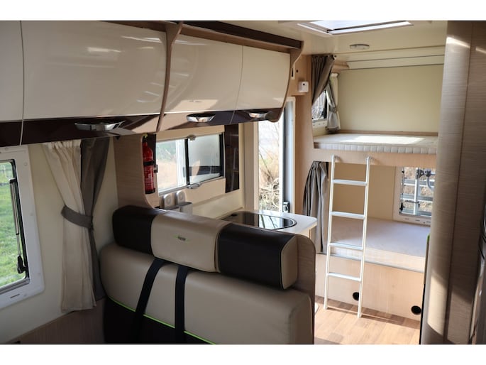 Dwarsstapelbedden (212/212x87/83 cm), 4-persoons dinette + tegenoverliggende 2-persoons dinette, alkoofbed (210x160 cm), ombouwmogelijkheden voor extra slaapplaatsen (180x121 cm + 140x64 cm), alkoofbed (210x160 cm), Heki-dakluik, Miniheki, combirollo’s met verduistering en horren op alle ramen, hordeur, panoramaraam in de opbouwdeur.