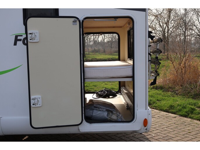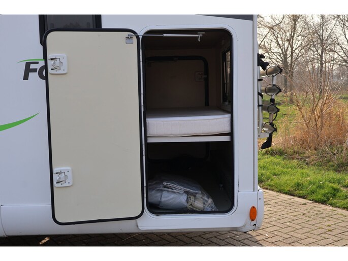 Fiamma luifel, 16" banden, 4-fietsdrager, achtergarage met extra zijdeur links (125x70 cm).