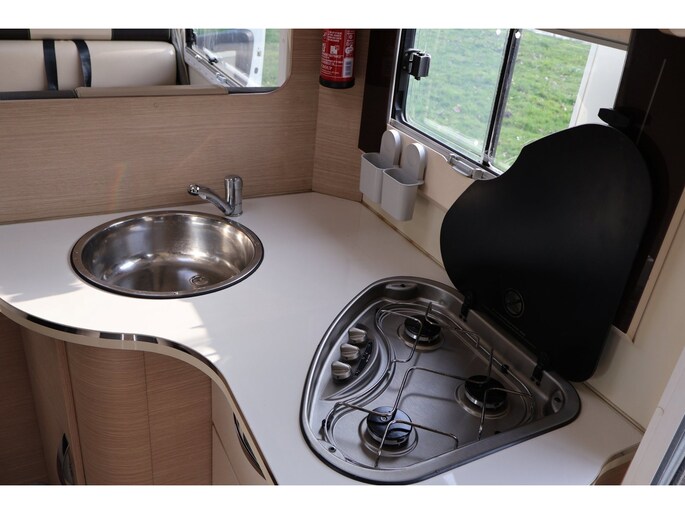 Hoekkeuken, 2-pits gasfornuis, Thetford koelkast met vriesvak, kledingkast, LED-spotverlichting, GFK-dak/-vloer/-opbouw, voortentlamp.