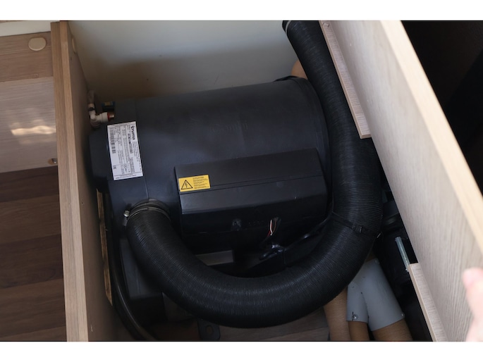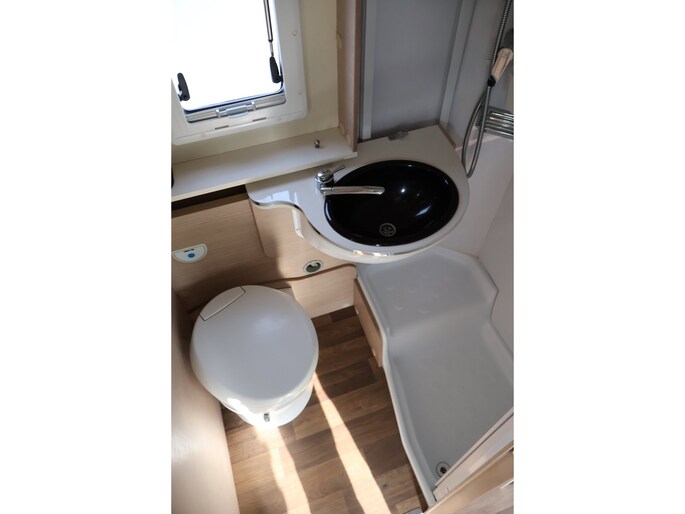 Badkamer met cassette toilet en wasgelegenheid, schoonwatertank 100 l - vuilwatertank 100 l, Truma Combi verwarming, warmwaterboiler.