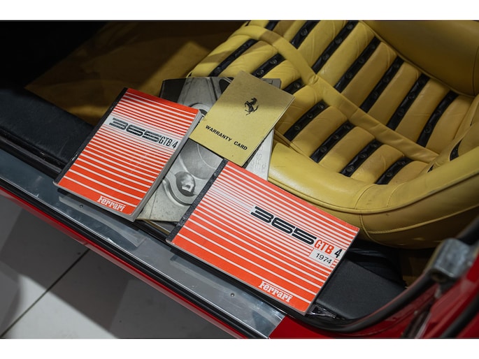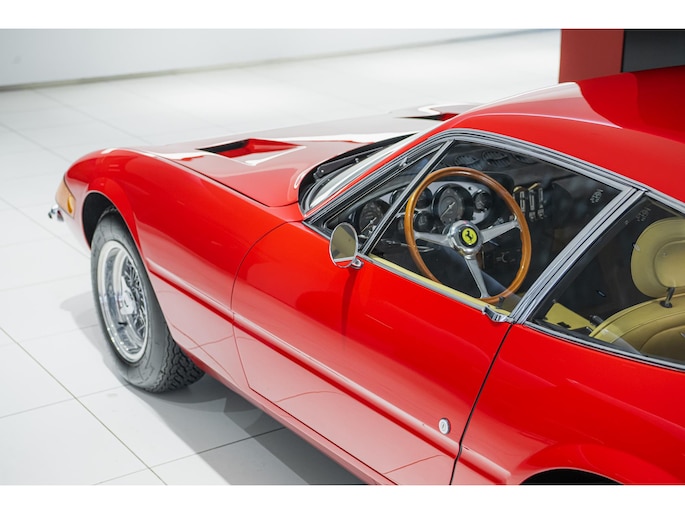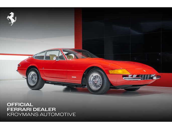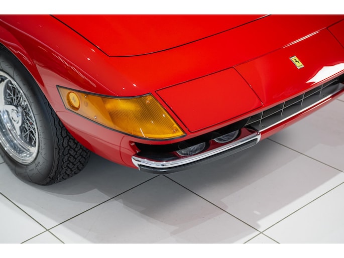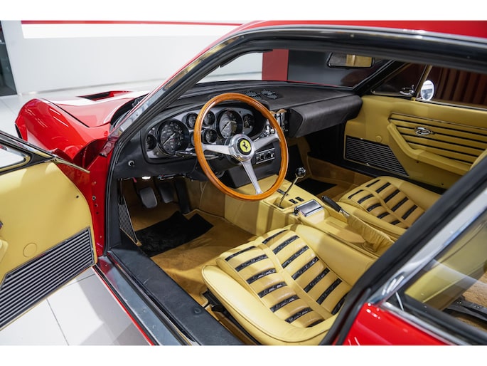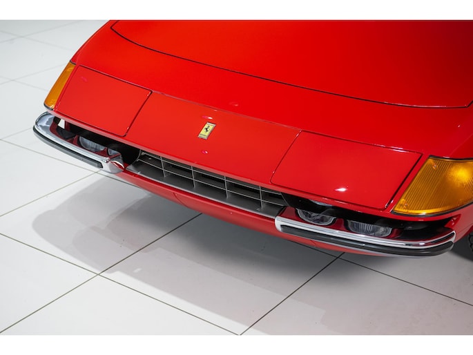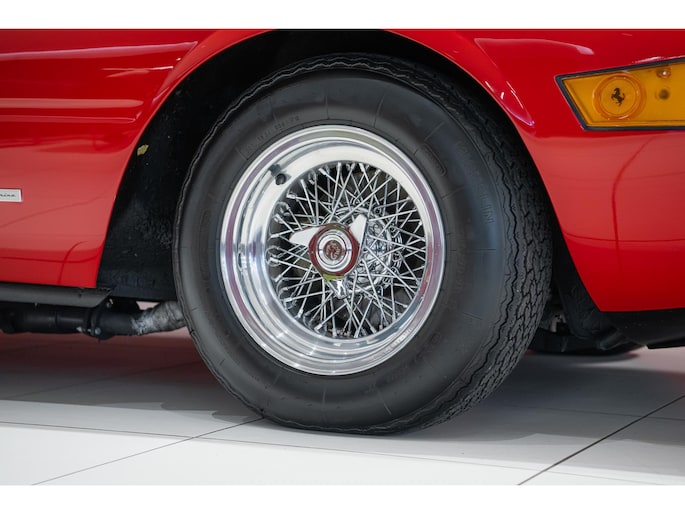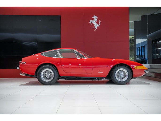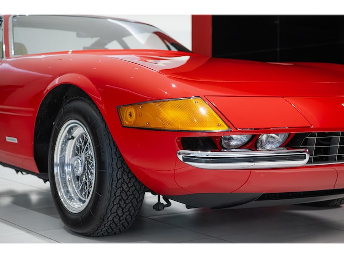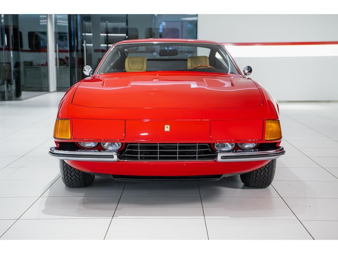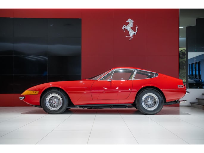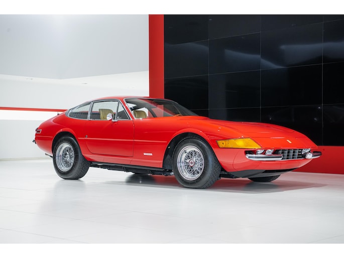As this incredibly pristine 1972 example demonstrates, the 365 GTB/4 delivered its passengers in luxury and refinement worthy of the Ferrari name. One of 1,383 produced from 1968 through 1972, S/N 15443 is classically turned out in red over a tan leather interior featuring power windows, a wood-rimmed Nardi steering wheel, Veglia instrumentation and a gated shifter. The car invites the closest scrutiny, displaying concours-quality fit, finish and detailing. Completed with Ansa exhaust and Michelin XWX radials on chromed Borrani knock-off wire wheels, it shows just 42,175 miles and comes with books, a warranty card and the ever-important tool roll. Classiche Certication inspection completed in 2025.