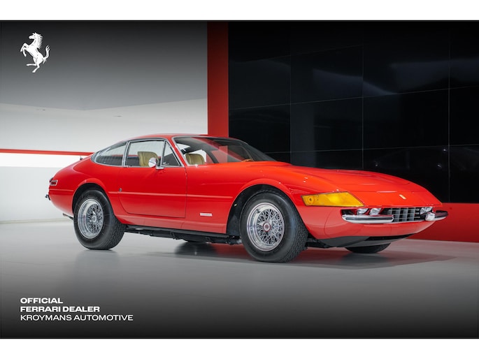 As this incredibly pristine 1972 example demonstrates, the 365 GTB/4 delivered its passengers in luxury and refinement worthy of the Ferrari name. One of 1,383 produced from 1968 through 1972, S/N 15443 is classically turned out in red over a tan leather interior featuring power windows, a wood-rimmed Nardi steering wheel, Veglia instrumentation and a gated shifter. The car invites the closest scrutiny, displaying concours-quality fit, finish and detailing. Completed with Ansa exhaust and Michelin XWX radials on chromed Borrani knock-off wire wheels, it shows just 42,175 miles and comes with books, a warranty card and the ever-important tool roll. Classiche Certication inspection completed in 2026.