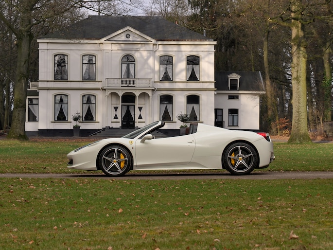 Net binnen: Ferrari 458 Spider, subliem in zowel z'n samenstelling als algehele staat. Uitgevoerd in Bianco Avus met volledig Iroco lederen interieur, bruine stiksels, elektrisch verstelbare en verwarmde Daytona seats, gepolijste wielen, Giallo remklauwen en uiteraard de Scuderia shields op de voorschermen.
