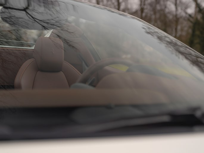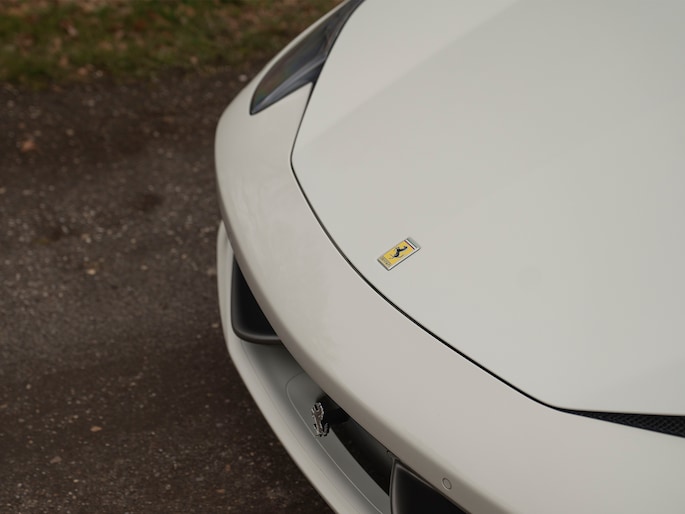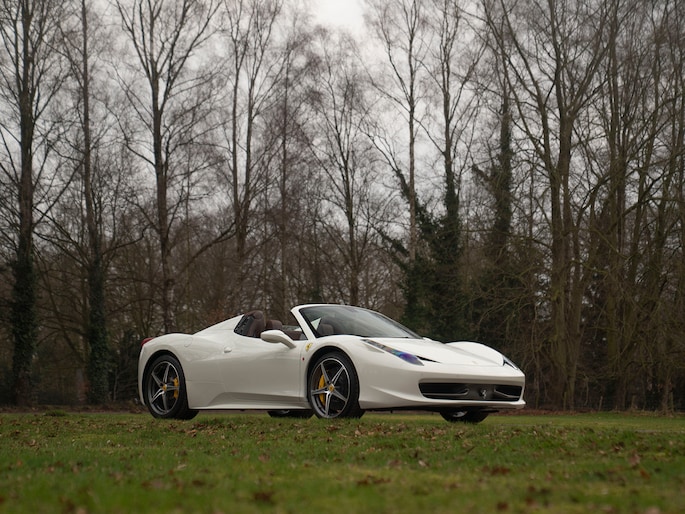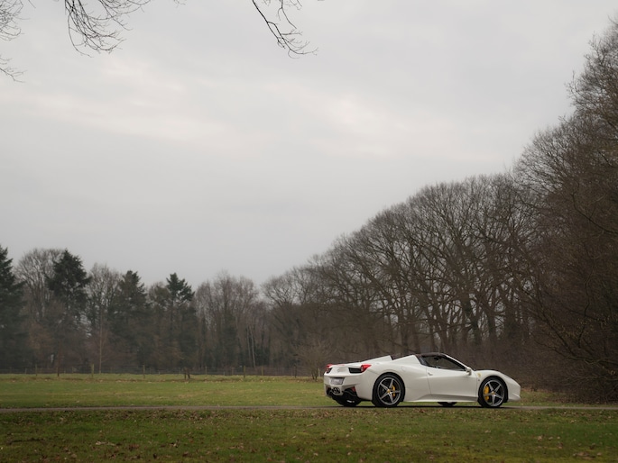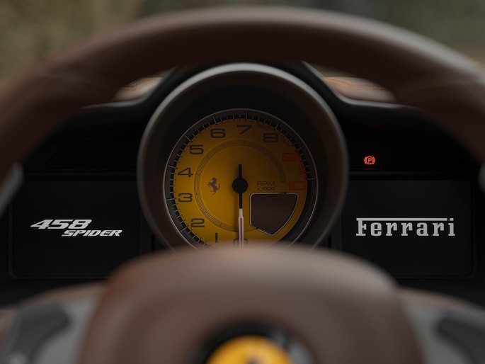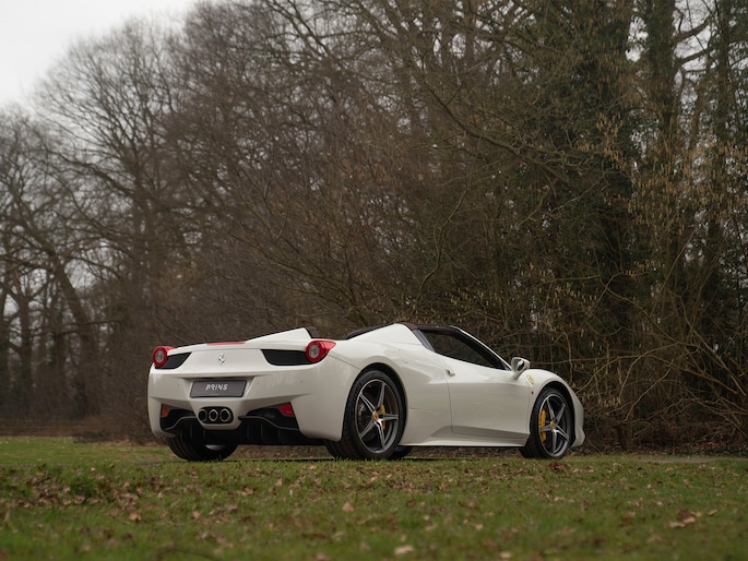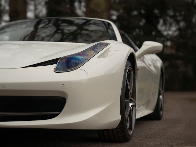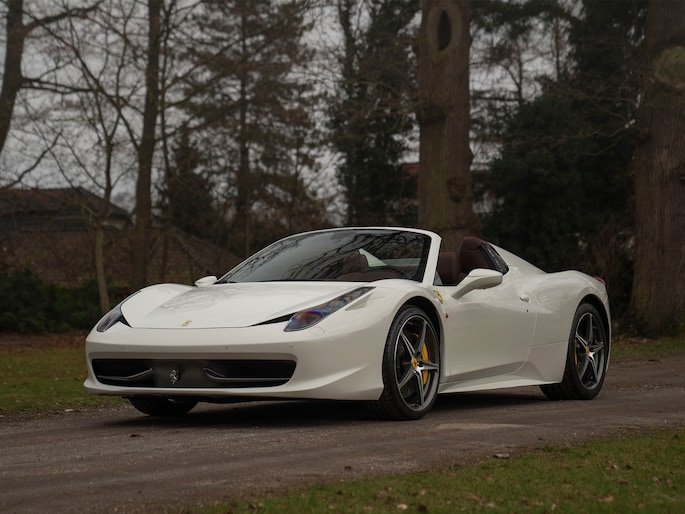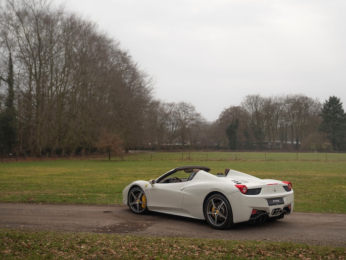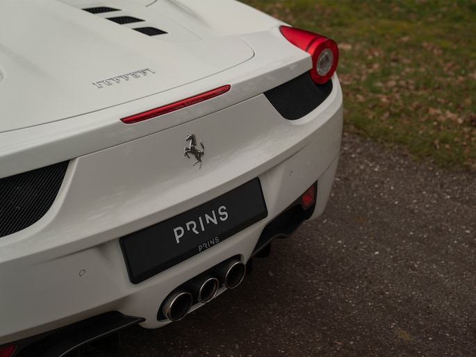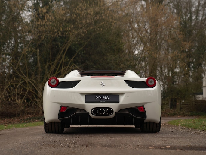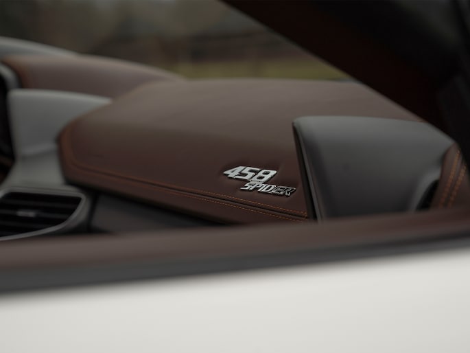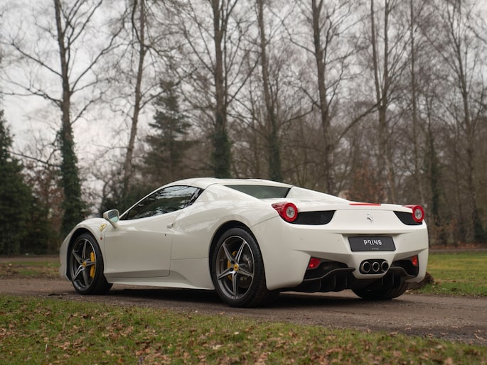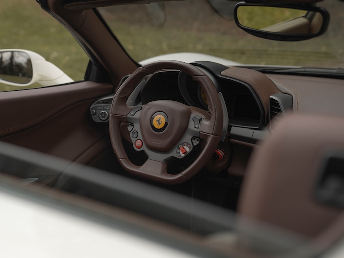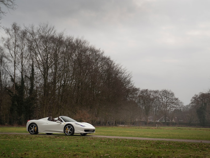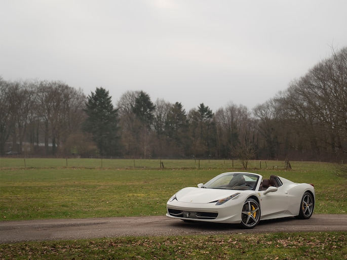 Net binnen: Ferrari 458 Spider, subliem in zowel z'n samenstelling als algehele staat. Uitgevoerd in Bianco Avus met volledig Iroco lederen interieur, bruine stiksels, elektrisch verstelbare en verwarmde Daytona seats, gepolijste wielen, Giallo remklauwen en uiteraard de Scuderia shields op de voorschermen.