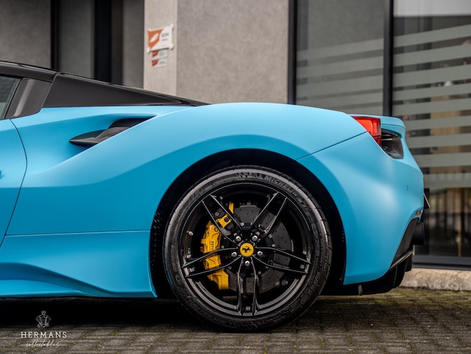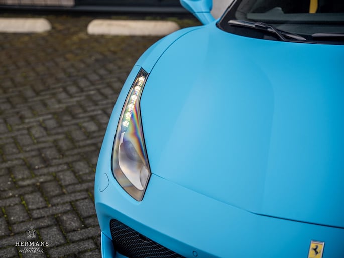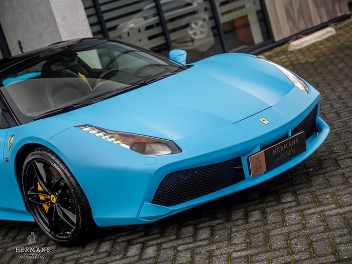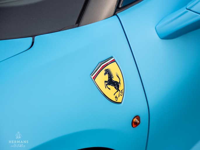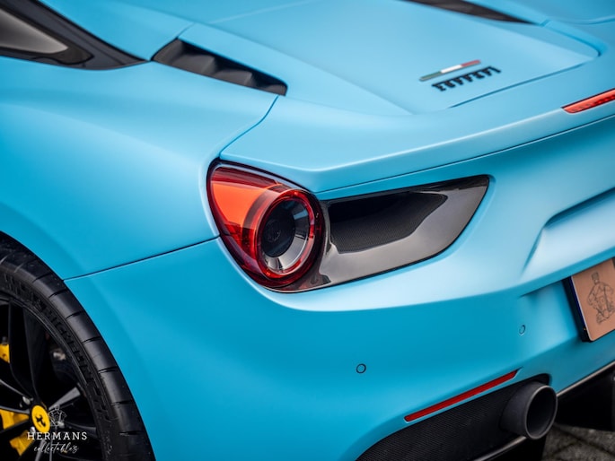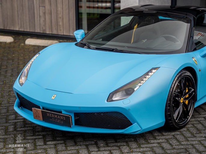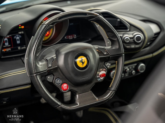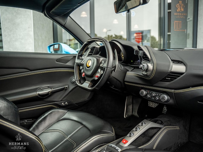 De 488 is origineel uitgevoerd in de kleur ''Blu Pozzi'' in combinatie met het ''Nero 8500'' interieur met gele stiknaden afwerking.
