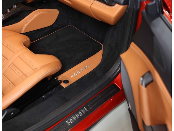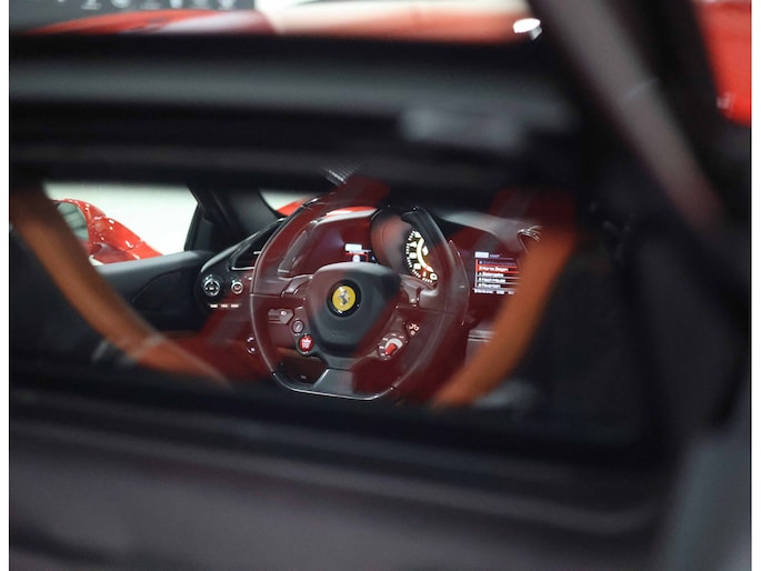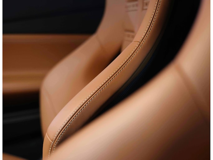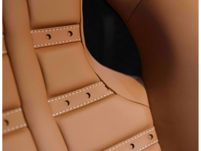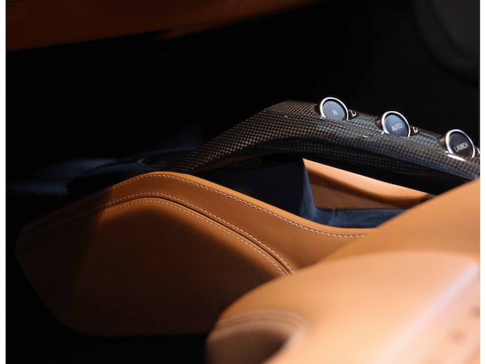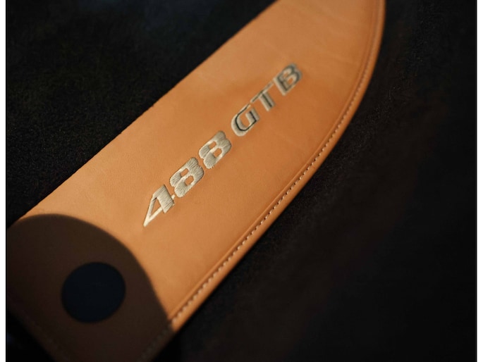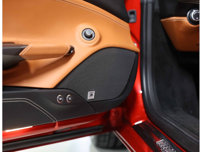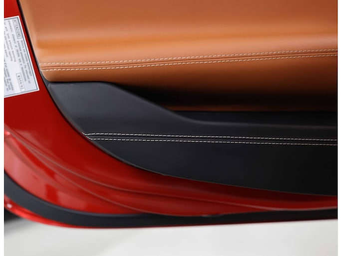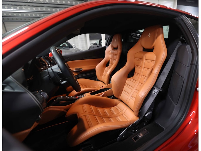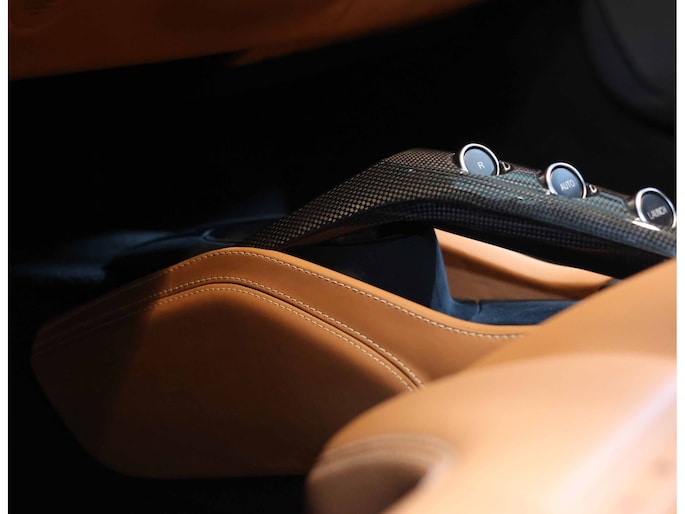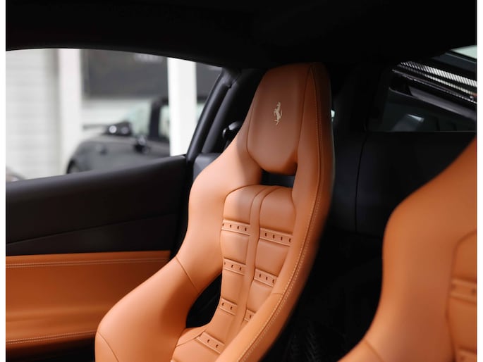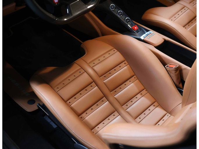 In het interieur gaat het feest verder. Hier vinden we Daytona Racing seats, bekleed in Cuoio volleder en versierd met contrasterende stiksels in Beige Chiaro. De Cavallino’s, het beeldmerk van Ferrari, zijn eveneens in Beige Chiaro in de hoofdsteunen gestikt. De stoelen zijn uitgevoerd in de maat Large en extra comfortabel.