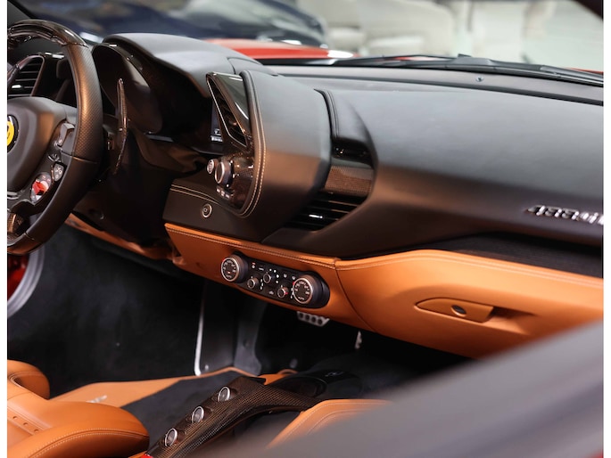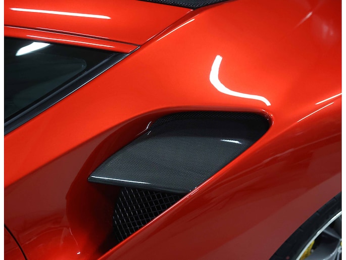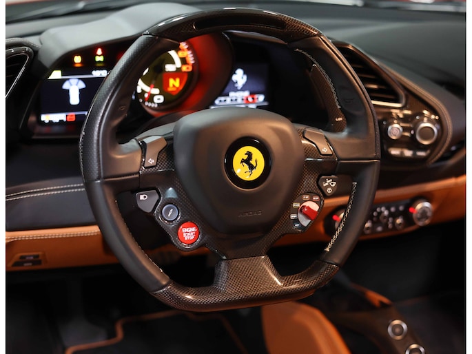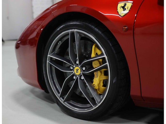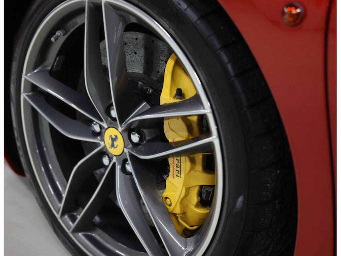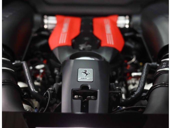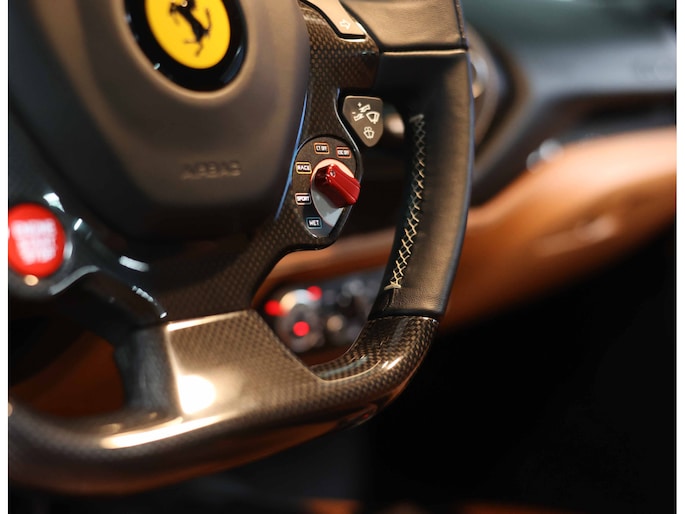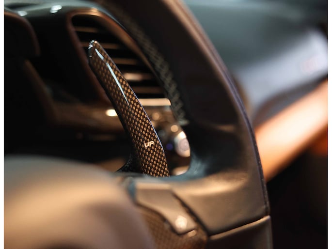 U zult ook opmerken dat er op niets is bespaard bij het samenstellen van deze auto. Zo is het exterieur voorzien van sportieve carbon details, waaronder de zij-luchtinlaten en de diffuser. Zelfs tussen de 20” velgen en de keramische remmen is carbon te vinden. Uiteraard zijn de iconische Scuderia Racing Shields ook aanwezig op de zijschermen, waarvan de gele kleur perfect matched met de gele naafdoppen en de gele remklauwen.
