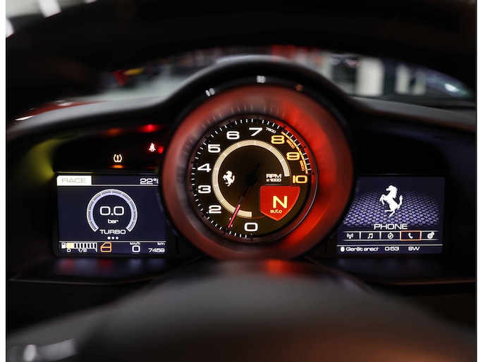 De gele toerenteller is het visuele middelpunt van de cockpit. Een knipoog naar Ferrari’s raceroots. Elke keer dat de naald richting 8.000 toeren klimt, komt de 3.9-liter V8-twin-turbo tot leven met een symfonie waar Andrea Bocelli jaloers op zou kunnen worden: scherp, fel, en met die typerende Ferrari-schreeuw die kippenvel bezorgt.