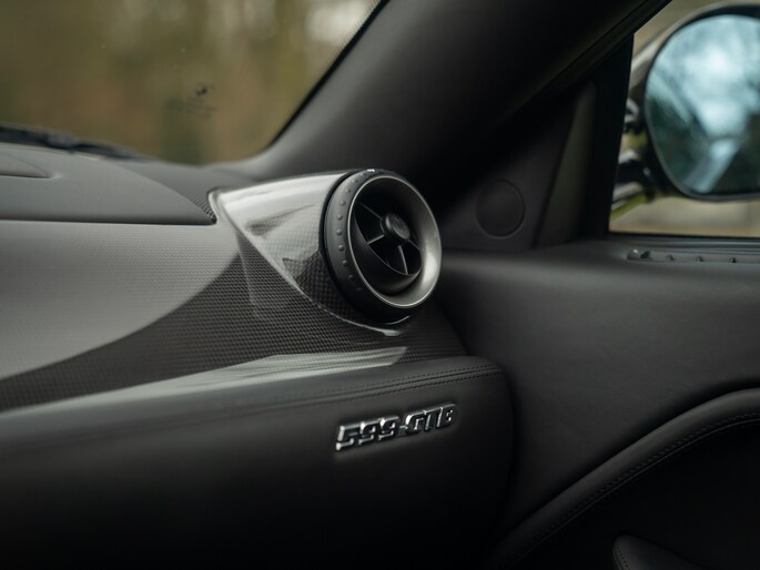 Onze 599 Fiorano moet het niet hebben van zijn uitbundige kleurgebruik. “Mooi”, horen we de purist denken. De Nero lederen bekleding mag dan geen verrassing zijn, het is wél doeltreffend. Net als de carbon interieurpakketten: onder andere het dashboard en de tunnelconsole zijn gemaakt van ultra lichtgewicht en peperduur koolstofvezel. De geperforeerde aluminium sportpedalen en carbon schaalstoelen nodigen extra uit om een bezoek aan het circuit te brengen. Fiorano bijvoorbeeld? De zetels houden de (let op: maximaal 2) inzittenden perfect in hun greep en zijn tevens elektrisch verstelbaar om de ideale zitpositie binnen no time gevonden te hebben. Bij de stoelverwarming zetten we echter vraagtekens. Hoe is het mogelijk om het níet warm te krijgen aan boord van de Gran Turismo Berlinetta, met al zijn pure performance?