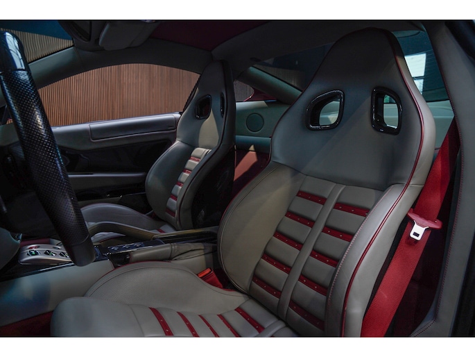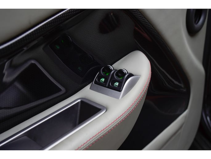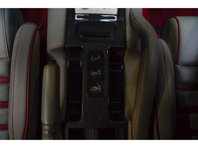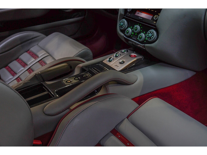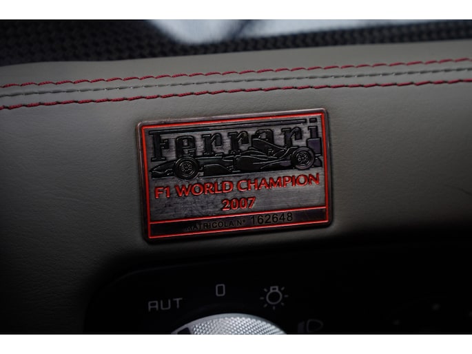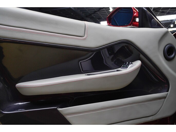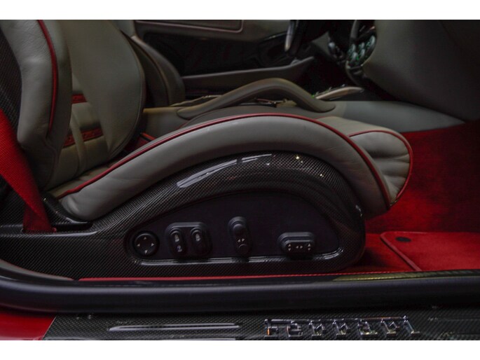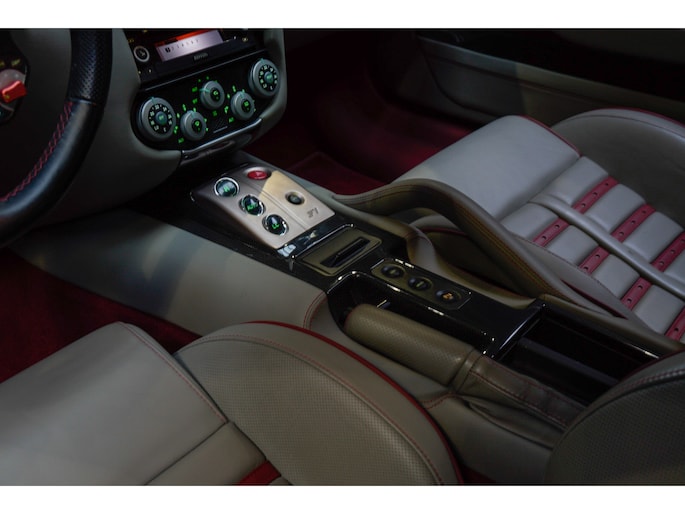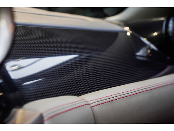 Binnenin wordt duidelijk dat deze Ferrari is samengesteld door een liefhebber. Het interieur is uitgevoerd in leder Rosso Tortora en rijkelijk voorzien van carbon accenten. De carbon instaplijsten, carbon interieurafwerking en het HGTE (Handling Gran Turismo Evoluzione) package onderstrepen het sportieve DNA van de auto.