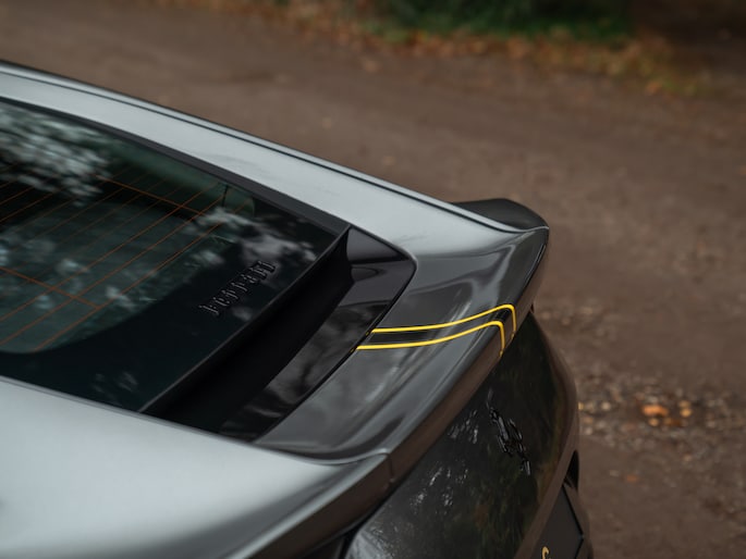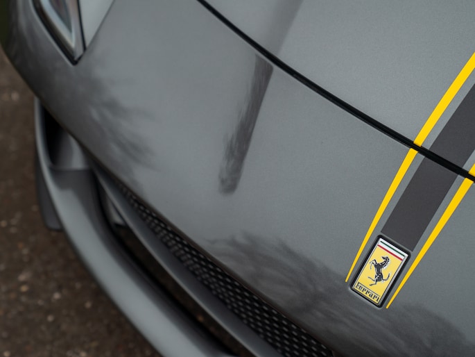 Zo verpletterend als V12 sound is, zo overweldigend is de uitstraling van de 812 Superfast. Gegoten in GrigioSilverstone laat de Italiaanse exoot zich van zijn meest elegante kant zien. Tegelijkertijd prikkelt het meesterwerk uit Maranello de zintuigen aan de hand van een fabelachtige finish, waaronder Oro Opaco Racing wielen in de maat 20 inch, Giallo remklauwen en een Nero met Giallo livery bestaande uit 3 middenbanen. De buitenste lijnen kleuren geel, wat betekent dat de middelste zwarte baan wordt doorgetrokken tot aan het iconische Ferrari embleem. Aan de achterzijde staat de striping lijnrecht boven een – eveneens zwarte – Cavallino. Aan het front lopen de Giallo biesjes juist door tot naast het gele logo. Aan werkelijk elk detail is gedacht; Italiaanser dan dit wordt het niet! Meer zwart is er in de vorm 4 uitlaat eindstukken en een steigerend paard in de grille. De meest opvallende emblemen bevinden zich echter op de voorste schermen: hier prijken de Scuderia Ferrari Shields zoals op de bolides van het gelijknamige raceteam. Toch kunnen we niet anders dan toegeven dat de 812 Superfast ook zonder al deze opsmuk bloedmooi is. De welvingen in de spatborden, inkepingen in de motorkap, aerodynamische flow in de portieren en niet te vergeten de enorme diffusor achter: de SF is en blijft een visuele krachtpatser!