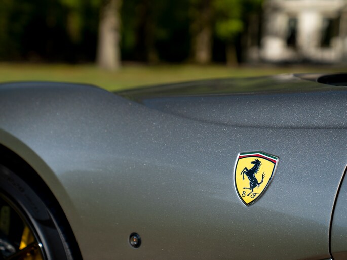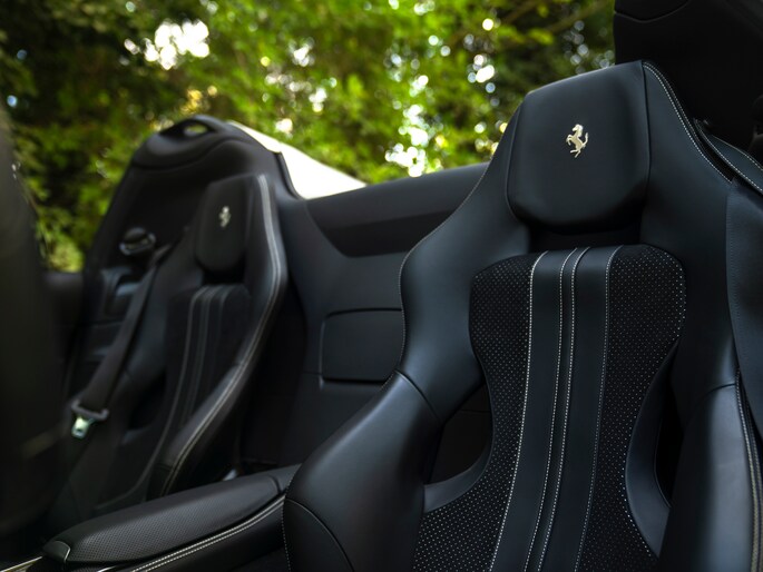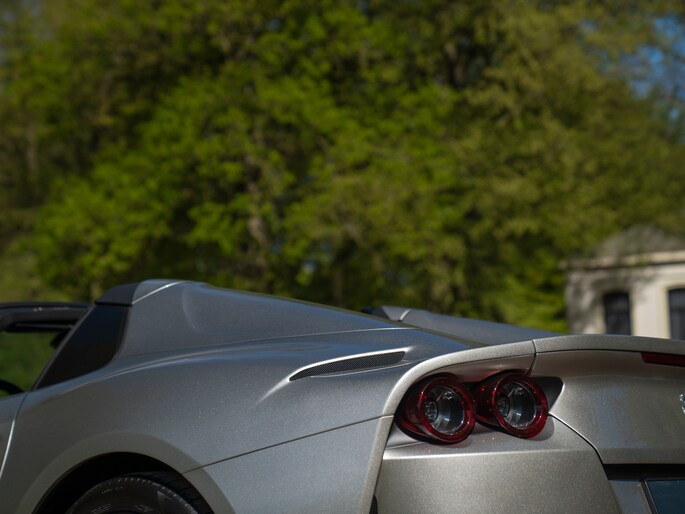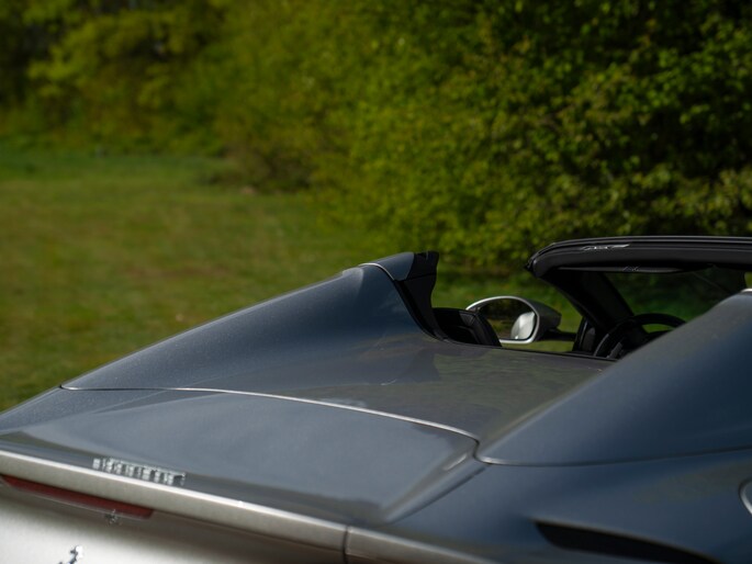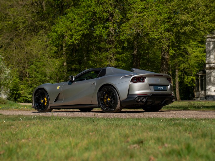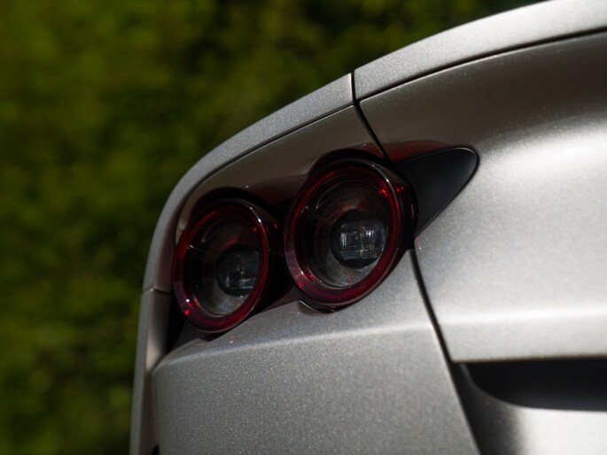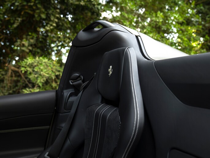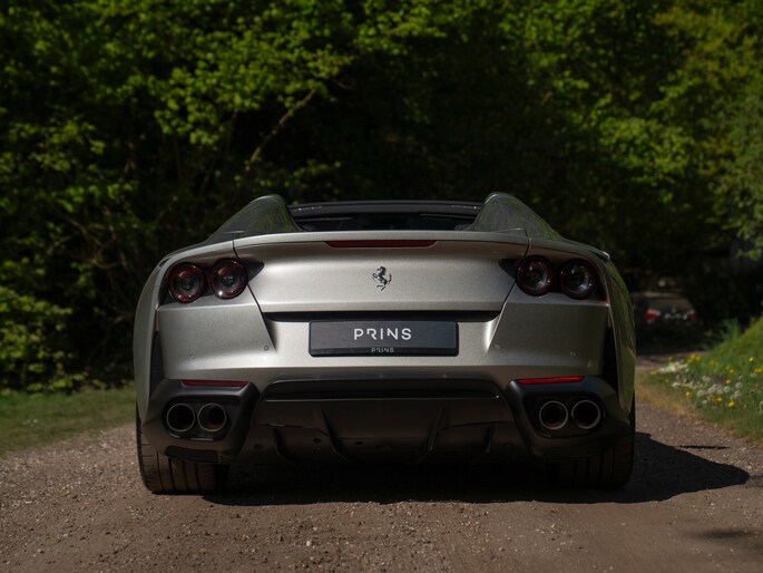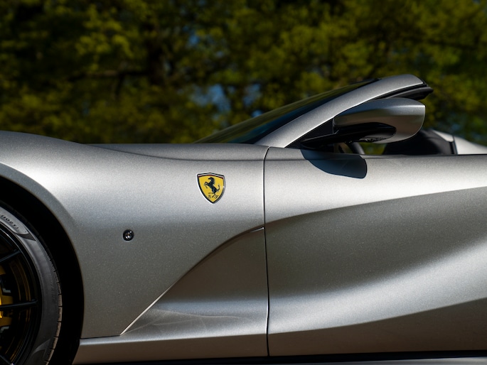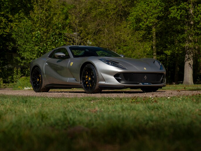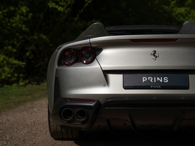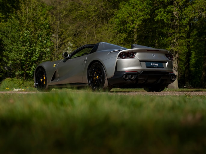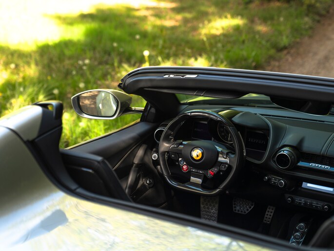 Over de schoonheid van de Ferrari 812 valt niet de discussiëren: dit is met gemak één van de fraaiste creaties uit Maranello uit de moderne tijd. De halfopen Gran Turismo Spider versie is favoriet vanwege de extra dimensie die dakloos rijden toevoegt. Bovendien roept de targa-achtige configuratie klassieke Ferrari 308 Magnum P.I. gevoelens op. Minstens zo charismatisch als Mister Magnum is de originele Aluminium Lucido carrosserielak. De intensiteit en speelsheid van de flinke hoeveelheid metallic in de lak is grotendeels afhankelijk van hoe het licht erop schijnt. In deze tijd van het jaar kunt u dus uw lol op. Behalve origineel, is de kleur uiterst stijlvol te noemen. Het zorgt voor een overall gedistingeerd voorkomen, terwijl racy details zoals de zwart gelakte Racing Wheels, antracietkleurige uitlaateindstukken, Giallo remklauwen en Scuderia Ferrari Shields op de voorschermen niets dan performance uitstralen. Al met al een even gewaagde als heerlijke combinatie.