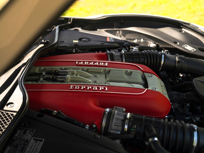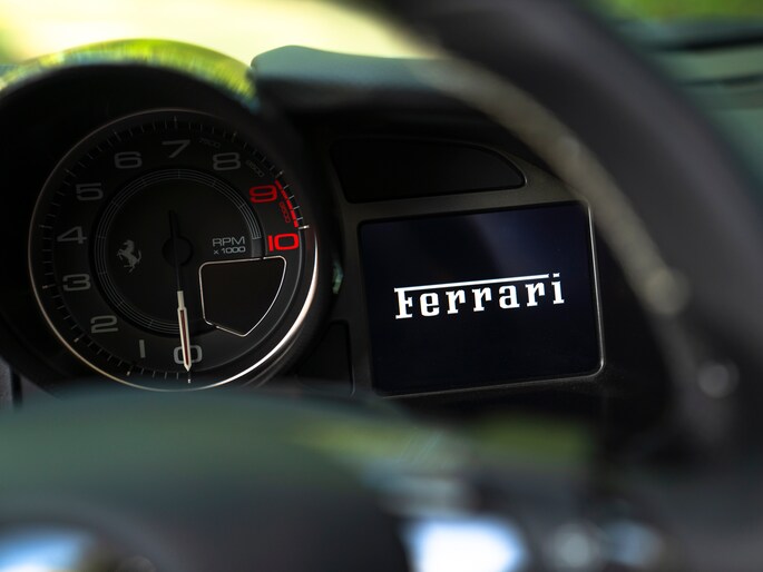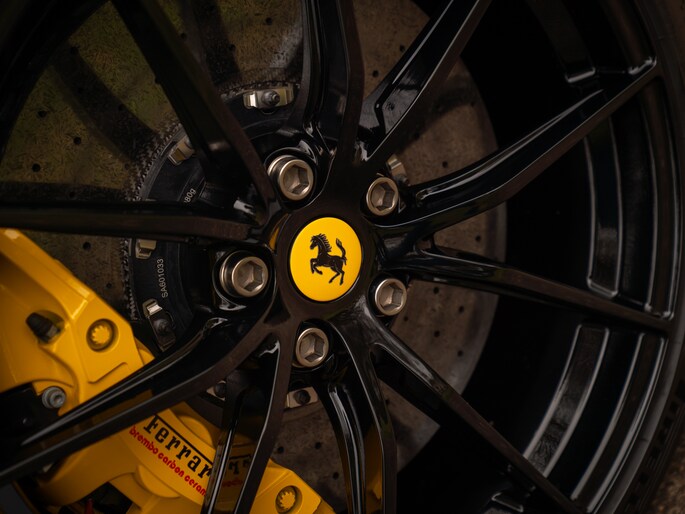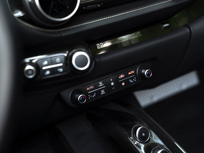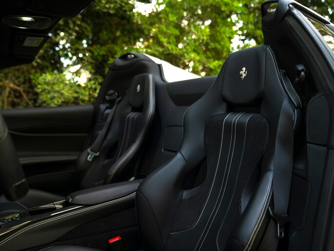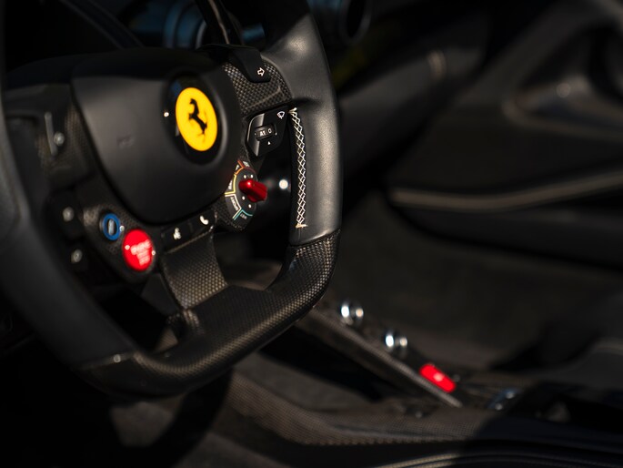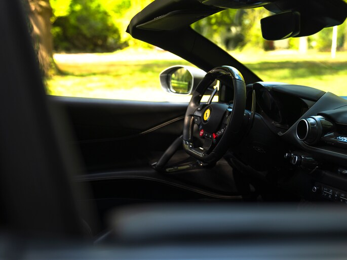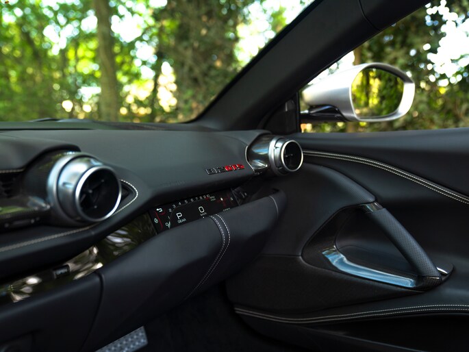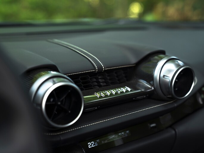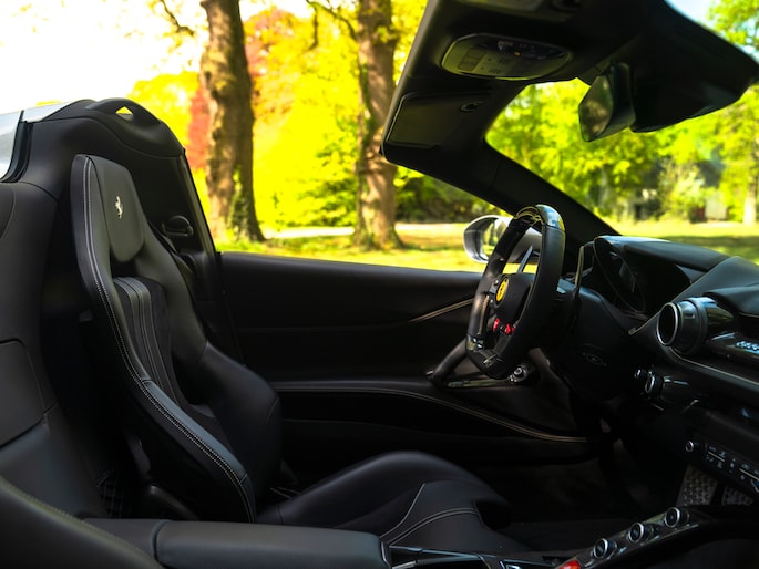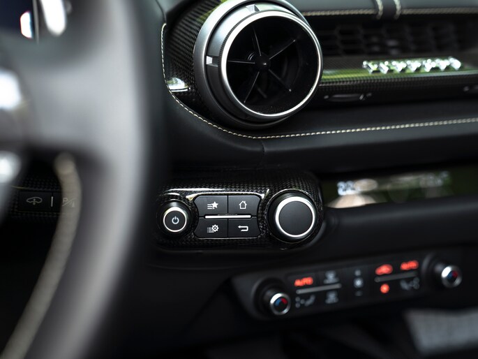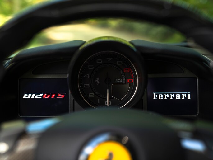 Zeggen we racy, dan zeggen we carbon. Zo ingetogen als de Nero lederen kleurstelling is in de cockpit van de Ferrari 812 GTS, zo uitbundig is de toepassing van peperdure koolstofvezel elementen: Carbon Racing Seats, Carbon Driver Zone, Carbon Central Bridge, alsook de instaplijsten en dashboard inserts zijn carbon-made. De oorspronkelijke eigenaar was duidelijk niet van het halve werk. Grigio Chiaro contraststiksels en dito Cavallino’s in de hoofdsteunen doorbreken het zwarte geheel op smaakvolle wijze. Maar de meeste aandacht verdienen toch wel de rode LED’s in het carbon stuurwiel, die vertellen wanneer het tijd is om via de carbon Shift Paddles een versnelling hoger in te schakelen. De schreeuwende 12-cilinder in het front komt ongedempt uw gehoorgangen binnen wanneer het dak eraf is. Kortom, u weet wat u te doen staat…