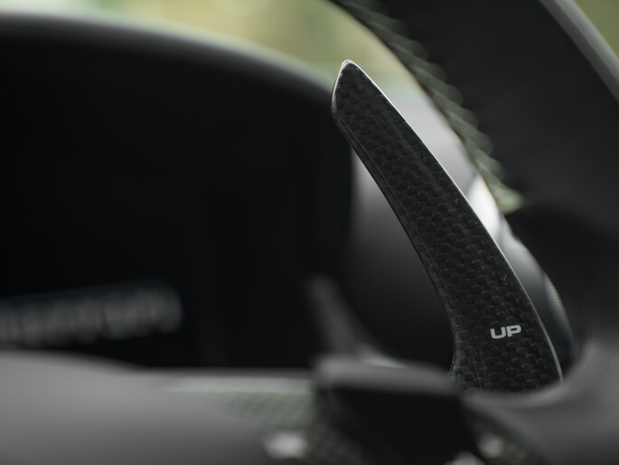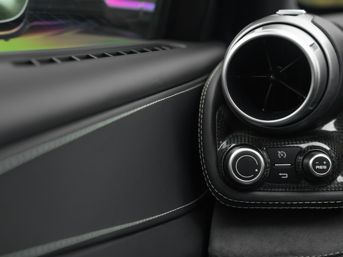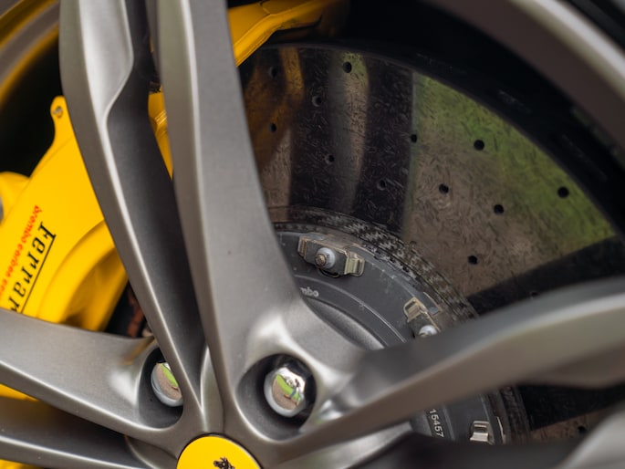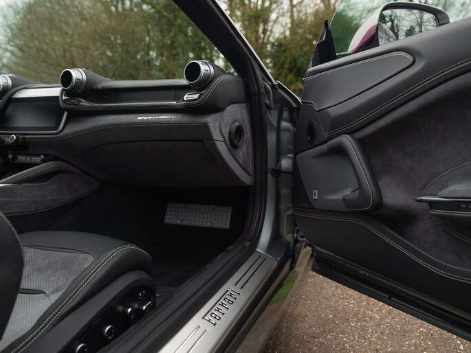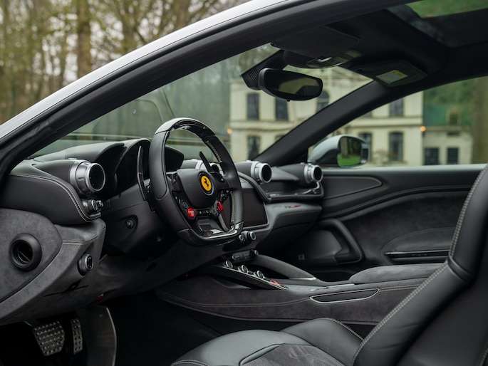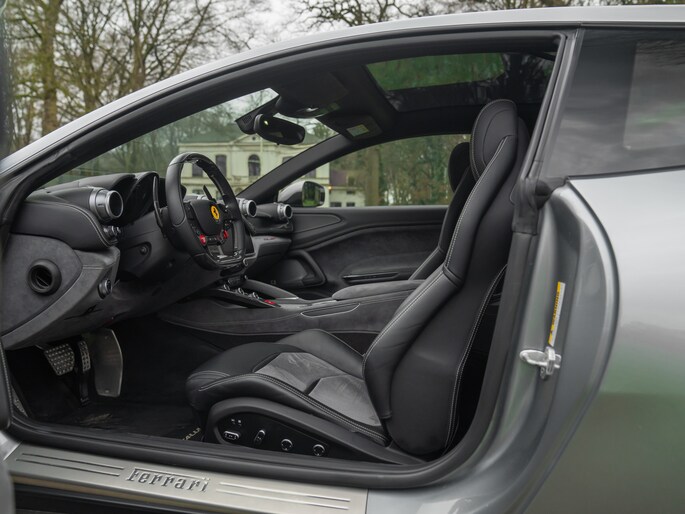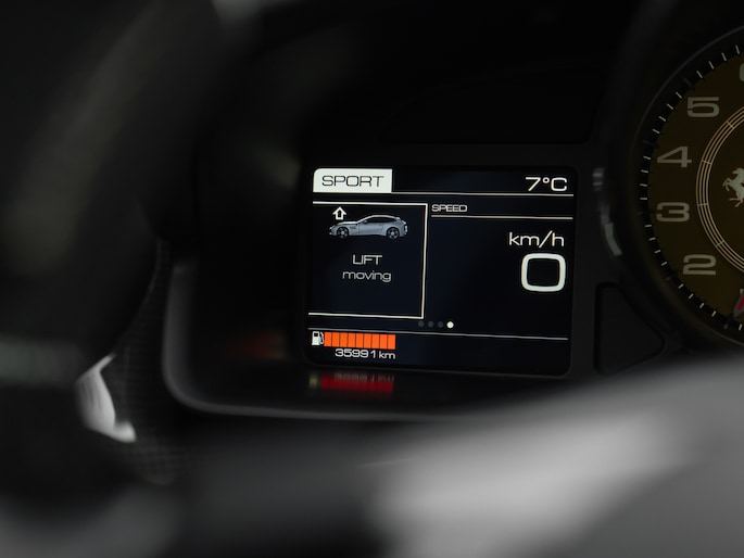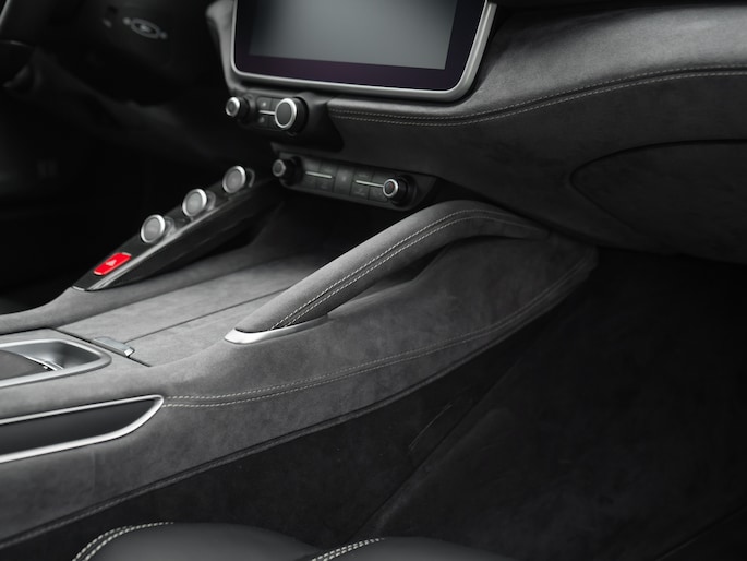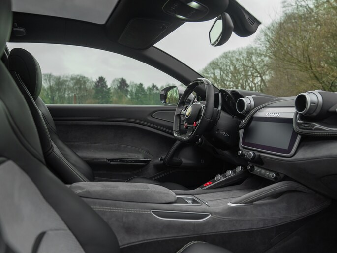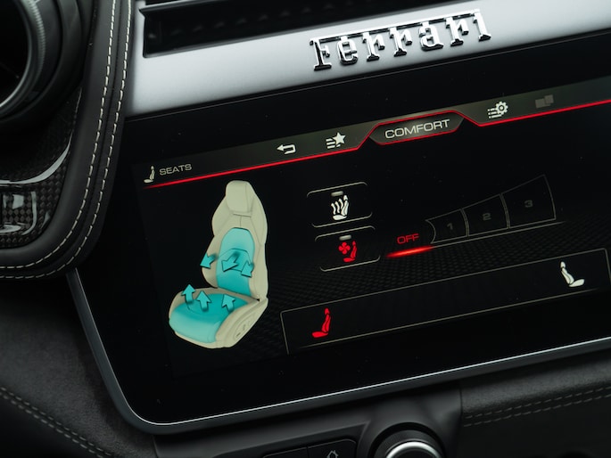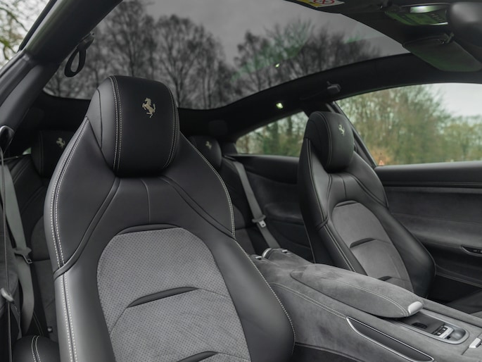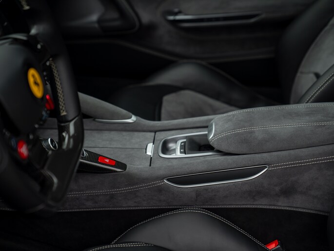Binnenin de 4-zits super-GT treft u een hightech cockpit overladen met allerlei luxe. Let bijvoorbeeld op de hoogwaardige afwerking: Nero lederen bekleding afgewisseld met Medio Alcantara delen en stiksels in dezelfde grijstint – inclusief de gestikte Prancing Horse op de hoofdsteunen. De Carbon Bridge, Carbon Driver Zone met LED Shift Indicator en Giallo rev-counter verraden het race-DNA van dit luxueuze raspaard.