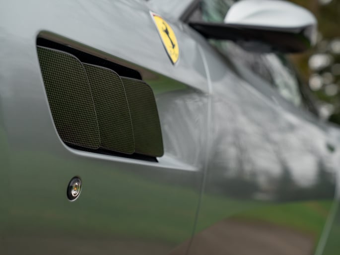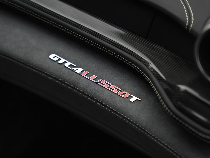 Progressief of conventioneel, in deze gedaante maakt de GTC4Lusso T een tijdloze indruk. Behalve het design, zijn de Grigio Titanio carrosseriekleur en diverse details daarvoor verantwoordelijk. Waaronder de Scuderia Ferrari Shields op de voorste schermen en grille met chromen afwerking. Helemaal van deze tijd zijn de grijs gekleurde dubbele 5-spaaks velgen met daarachter Giallo remklauwen, de zwarte uitlaatsierstukken en uit carbon vervaardigde luchtinlaten achter de voorwielen. Het glazen panoramadak verdient evengoed extra aandacht, al is het alleen al vanwege de meerprijs van deze optie: € 14.000,-!