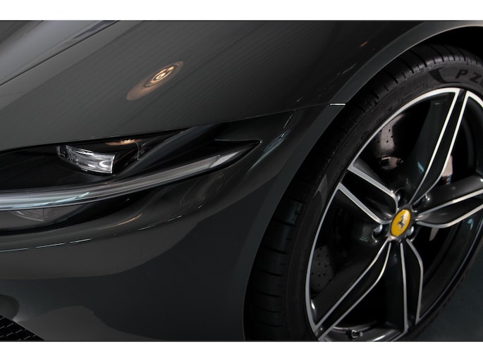 De gespierde carrosserie straalt schoonheid en aerodynamische efficiëntie uit, waarbij de Grigio Scuro-lak de vloeiende lijnen van de Roma extra benadrukt. Deze Ferrari trekt de aandacht op de weg met zijn krachtige achterspatborden, kenmerkende ‘shark-nose’ grille en slanke LED-koplampen.