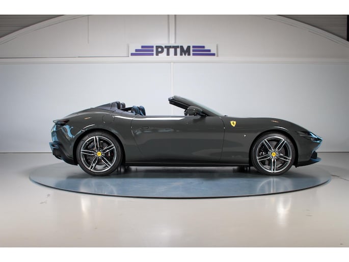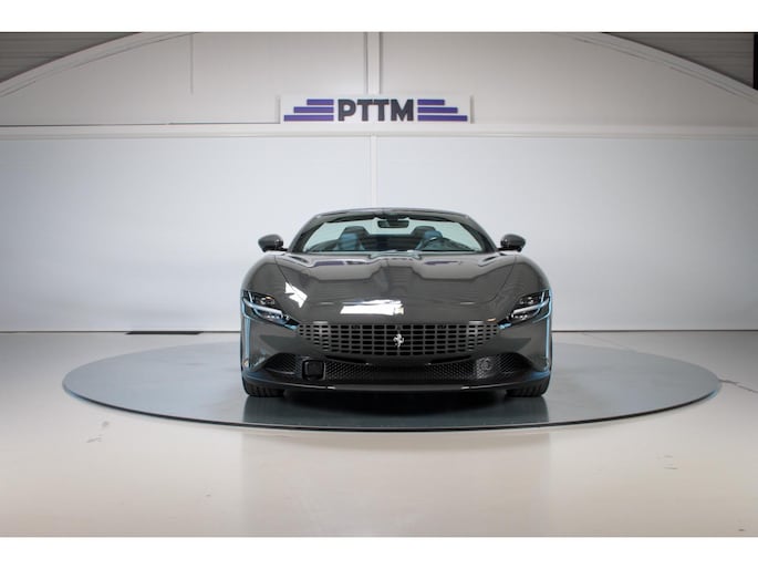Dit specifieke exemplaar van de 2024 Ferrari Roma is een unieke, kilometervriendelijke uitvoering die zich onderscheidt van andere kleuren dankzij de stijlvolle Grigio Scuro lak. Het contrasterende blauwe lederen interieur voegt een bijzondere luxe toe die perfect past bij het agressieve maar verfijnde karakter van de Roma.