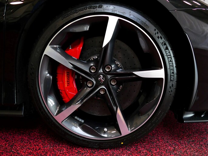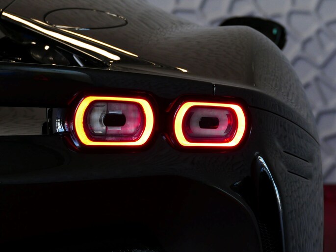 Deze SF90 is uitgevoerd in de elegante kleur Nero Daytona met een adembenemend Rosso Ferrari interieur. Elk detail ademt exclusiviteit en vakmanschap: