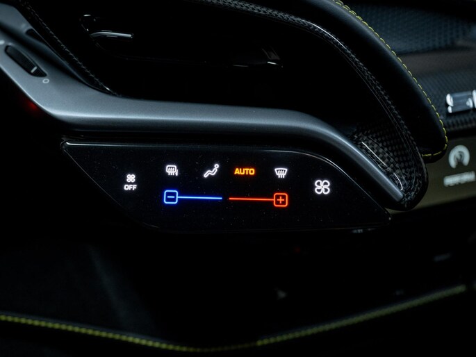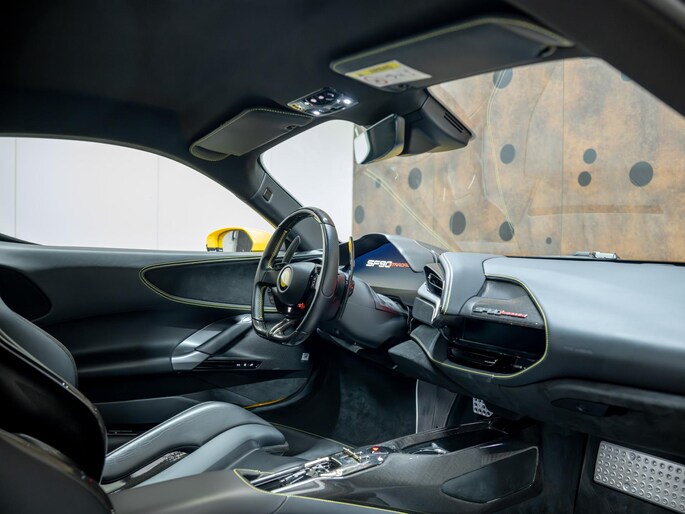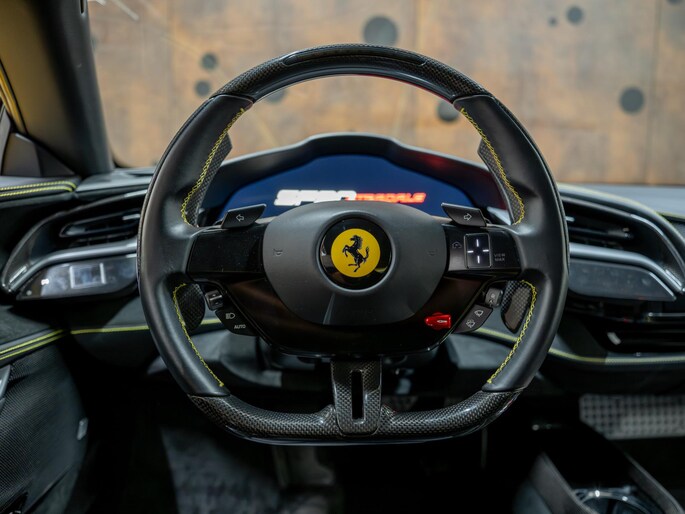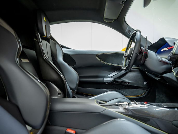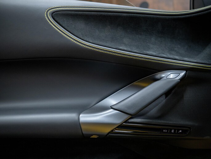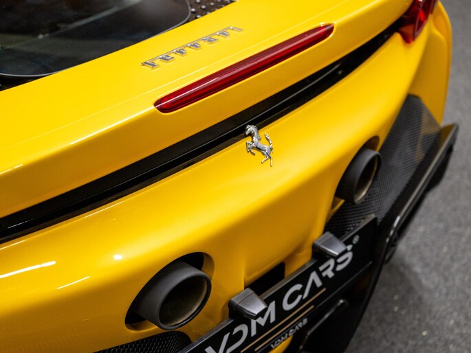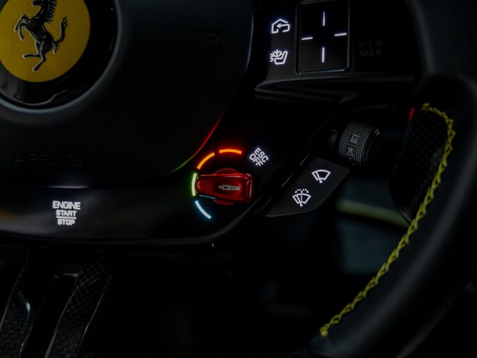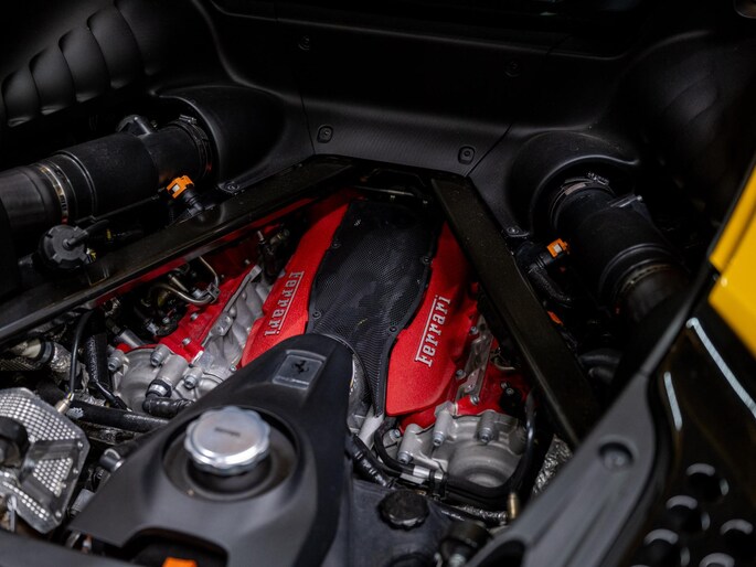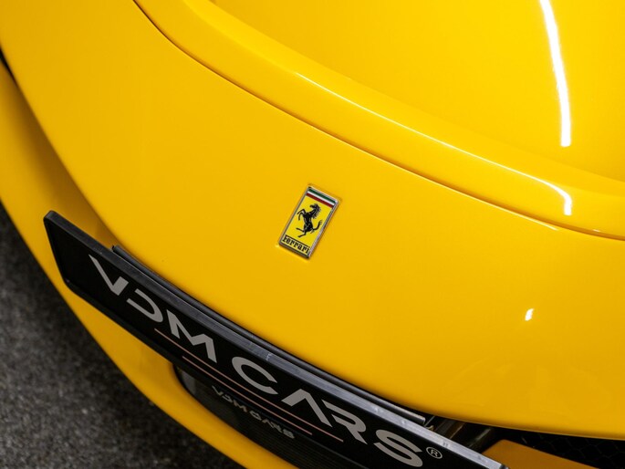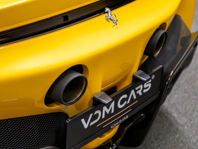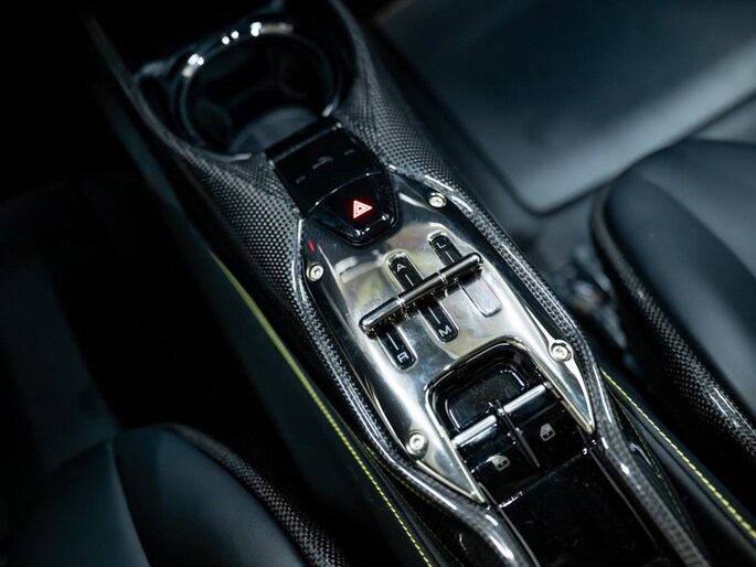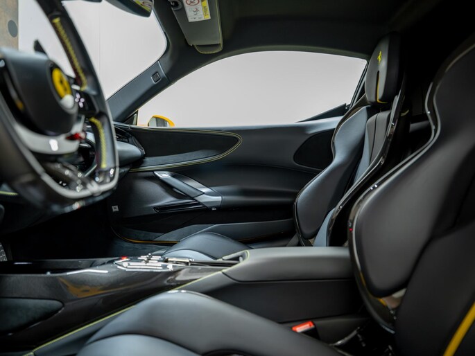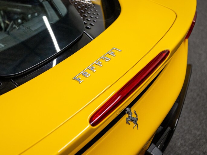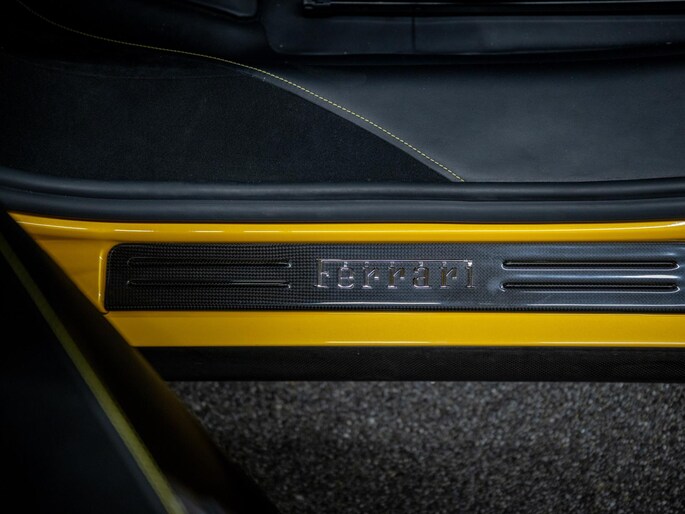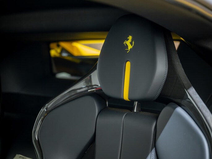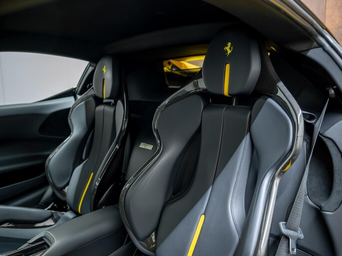 Dit exemplaar verkeert in zeer verzorgde staat en is samengesteld via het Atelier-programma van Ferrari. De auto is rijk uitgerust met hoogwaardige opties waaronder: een uitgebreid carbon pakket, carbon racing seats, LED shift indicators op het stuur en een premium Hi-Fi systeem. Ook praktische voorzieningen zoals een liftsysteem voor en achter, parkeersensoren rondom en een achteruitrijcamera zijn aanwezig. Het interieur is uitgevoerd in zwart leder met verfijnde gele accenten, waaronder speciale stiksels en geborduurde Cavallino-emblemen, die perfect aansluiten op het exterieur en het sportieve karakter van de auto benadrukken.