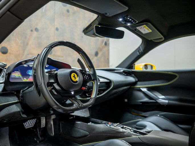 Aangeboden door VDM Cars: een Ferrari SF90 Stradale, Ferrari’s eerste plug-in hybride supercar waarin ongekende prestaties en geavanceerde technologie samenkomen. Uitgevoerd in de spectaculaire en zeldzame kleur Giallo Triplo Strato, een meerlaagse lak die zorgt voor een uitzonderlijke diepte en levendigheid. De unieke lak geeft de auto een dynamisch karakter: fel en sprankelend in direct zonlicht, terwijl het in zachtere lichtomstandigheden een warme, rijke gloed behoudt. In combinatie met het two-tone NERO DS en de uitgebreide carbon fibre accenten ontstaat een perfect uitgebalanceerde configuratie.