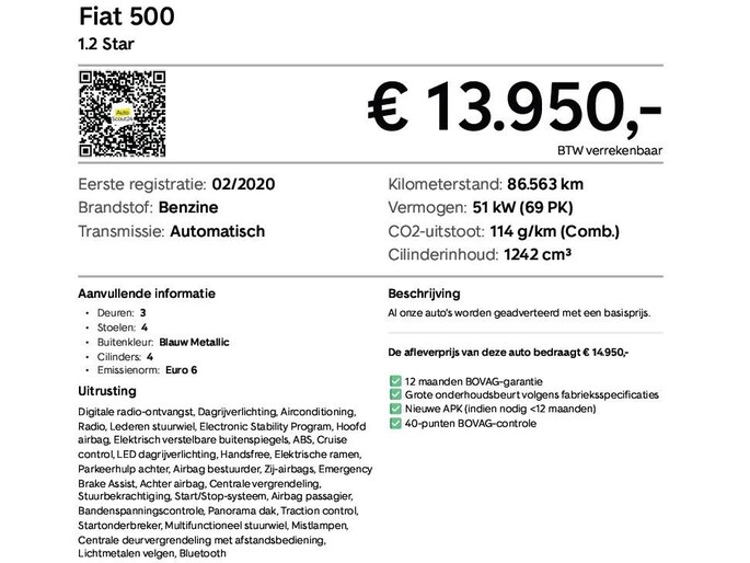 Stap in deze stijlvolle Fiat 500 en beleef direct hoe leuk autorijden kan zijn. De 1.2-liter benzinemotor geeft voldoende pit voor het stadsleven en de automaat zorgt dat je soepel en ontspannen op pad bent. Het sportieve karakter komt tot uiting dankzij de Sport-uitvoering met lichtmetalen velgen en een frisse blauwe metallic lak een echte eyecatcher.