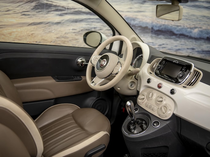Werkelijk alles wat wij graag zien in een auto heeft dit pareltje!: Die ultieme Fiat 500 kleur: Wit met een beige dakje, de onberispelijke lederen bekleding in de juiste kleuren: Beige met ivoor, de mooiste velgen en dan ook nog een automaat, wat wil je nog meer? Werkelijk een schitterende Fiat 500.