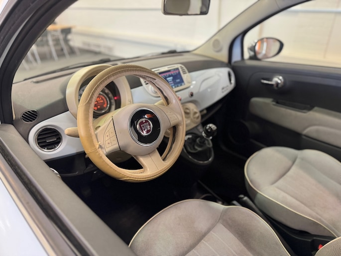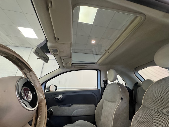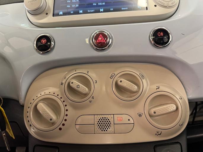 Het geluidssyteem in deze Fiat 500 is regelbaar met behulp van de audiobediening op het stuur. Allicht is er in deze auto ook airconditioning. Natuurlijk behoren lederen stuur, centrale deurvergrendeling met afstandsbediening en toerenteller ook tot de uitrusting van deze complete auto.