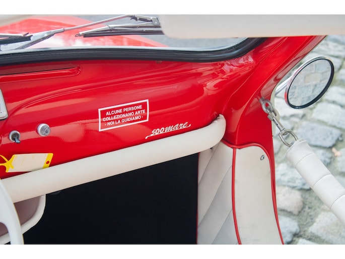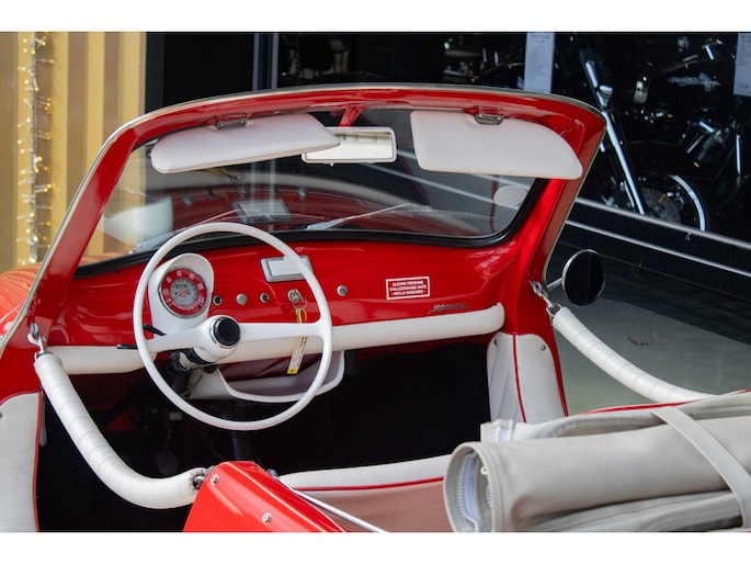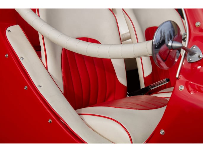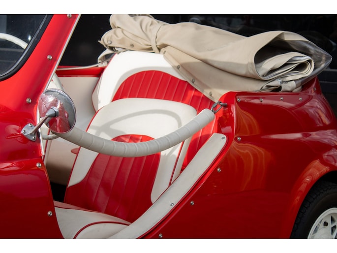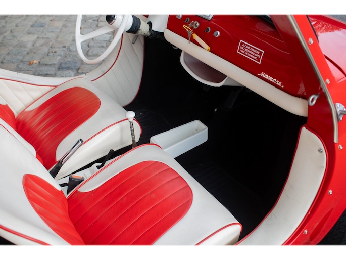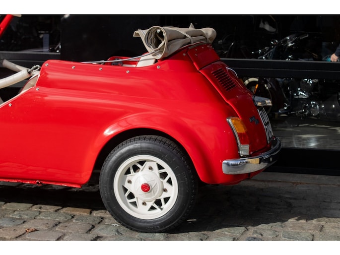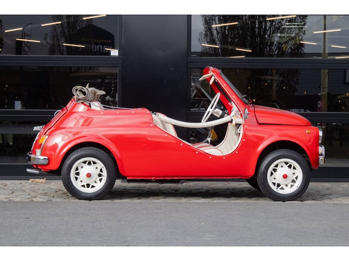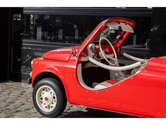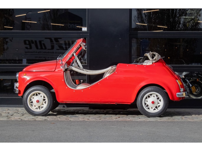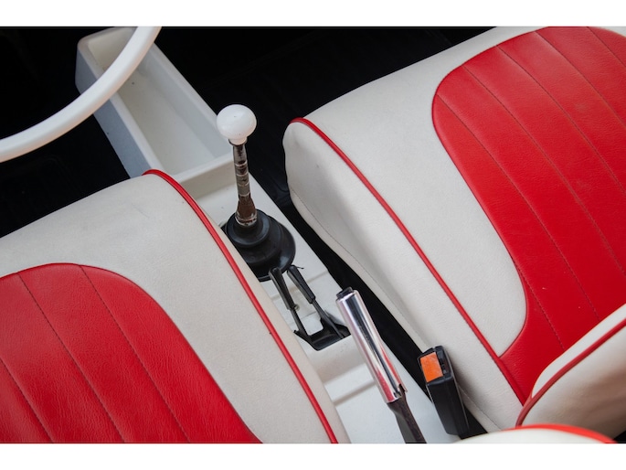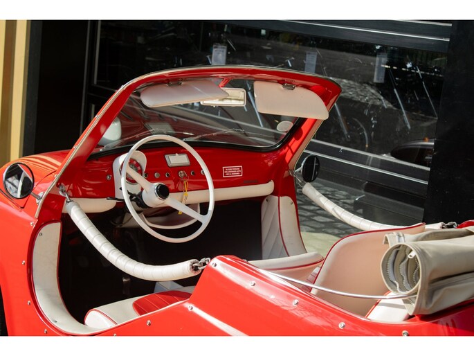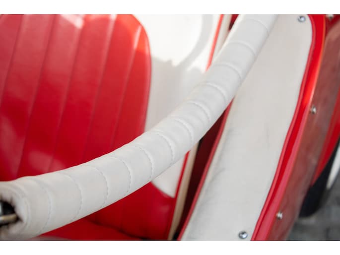 Uitgevoerd in een krachtige rode lak, gecombineerd met een rood-wit lederen interieur, ademt deze Jolly pure jaren ’60 charme. De crèmekleurige velgen zorgen voor een verfijnd contrast en versterken het klassieke silhouet. Het open karakter geeft de auto zijn onweerstaanbare uitstraling — luchtig, ontspannen en uitgesproken stijlvol.