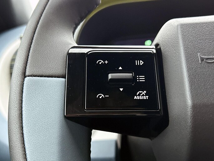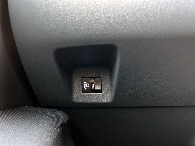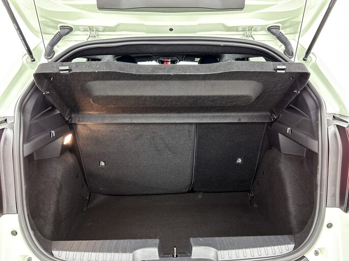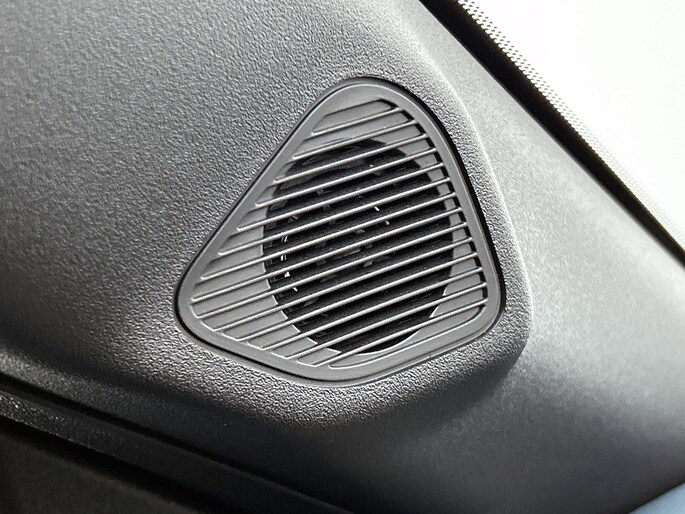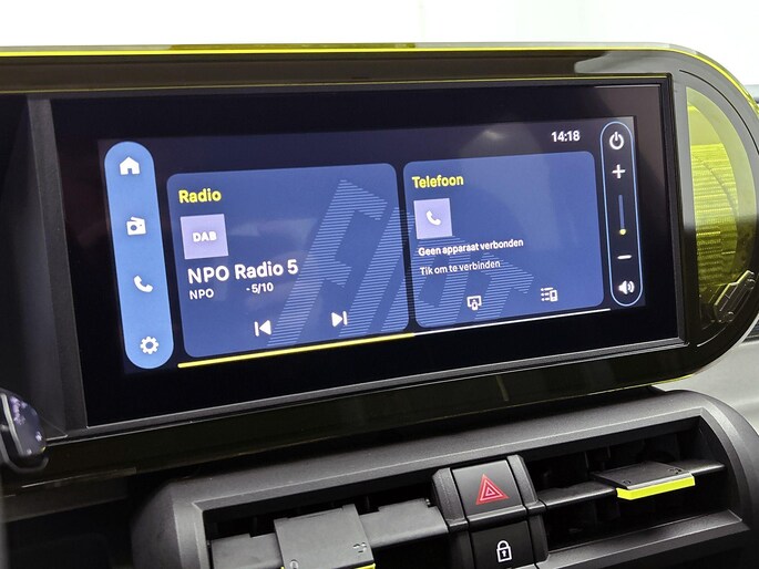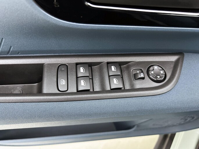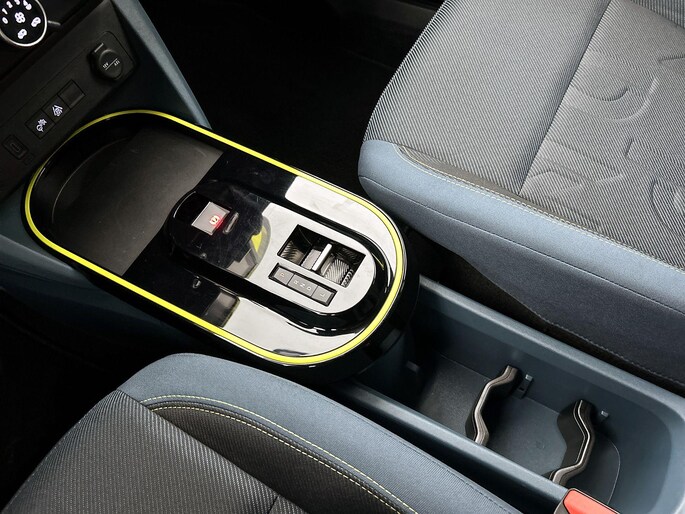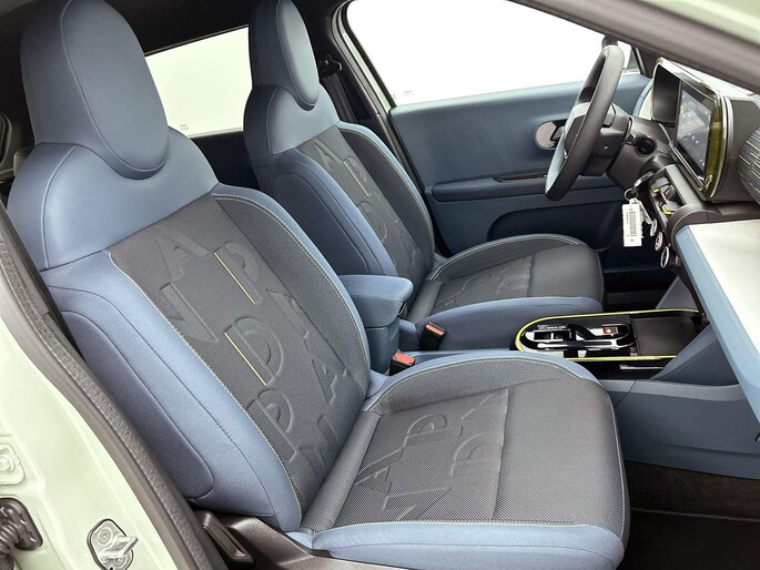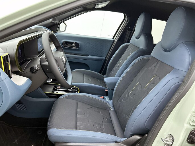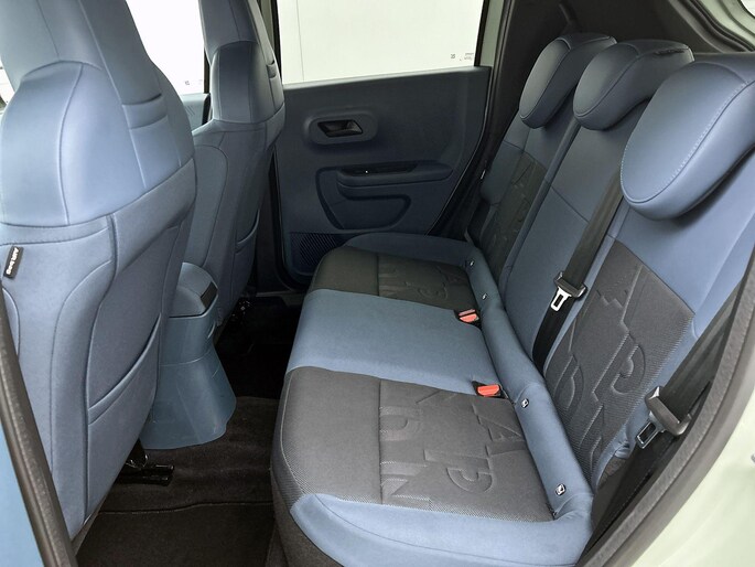 Interieurkleur: Blauwe stof met gele stiksels én panda-logo