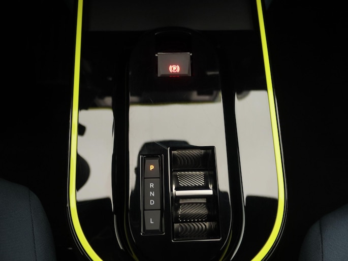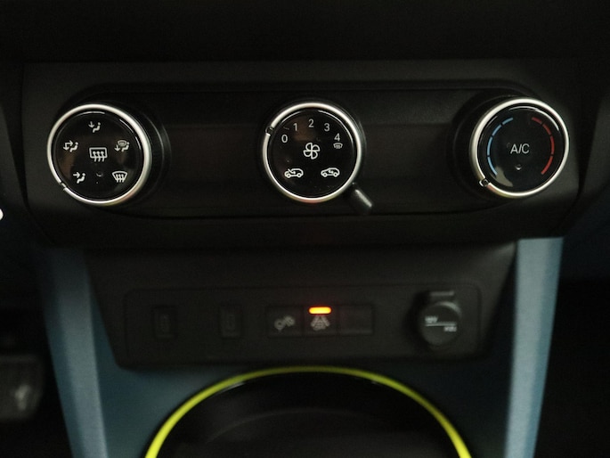Interieurkleur: Blauwe stof met gele stiksels én panda-logo