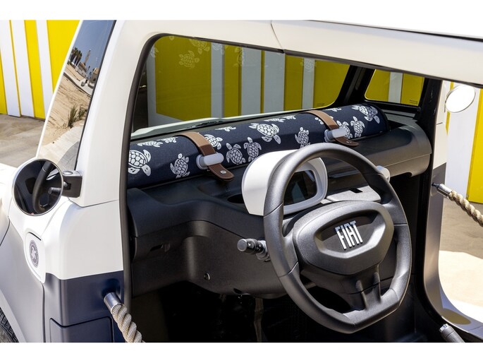 Ontdek de nieuwe Fiat Topolino Vilebrequin – Limited Edition! Deze exclusieve Topolino belichaamt de natuurlijke elegantie van de Riviera, waar het diepe blauw van de zee speelt met gestreepte parasols en retro strandcabines.