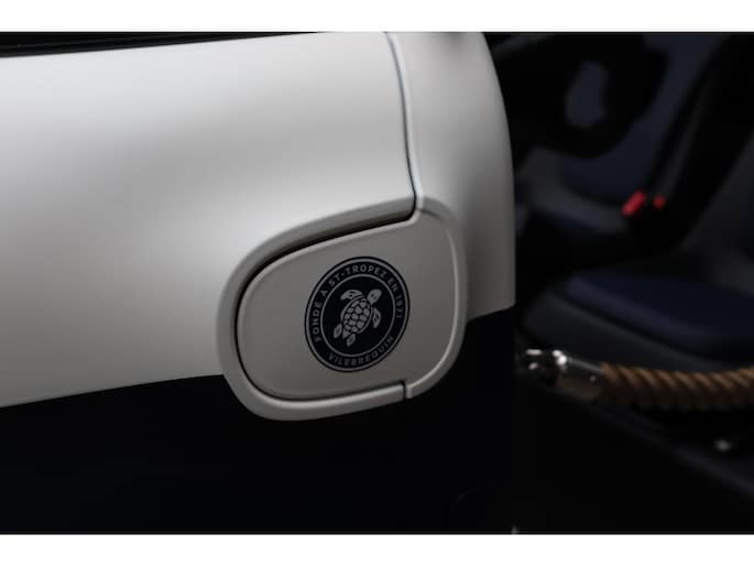 Deze exclusieve uitvoering ademt de geest van de Middellandse Zee: handgemaakt, elegant en vol karakter. De tweekleurige lak in wit en Marine Blue, het stoffen zonnedak en nautische details zoals teakvloeren en Vilebrequin-logo’s creëren een sfeer van la dolce vita – zorgeloos genieten met oog voor schoonheid en detail.