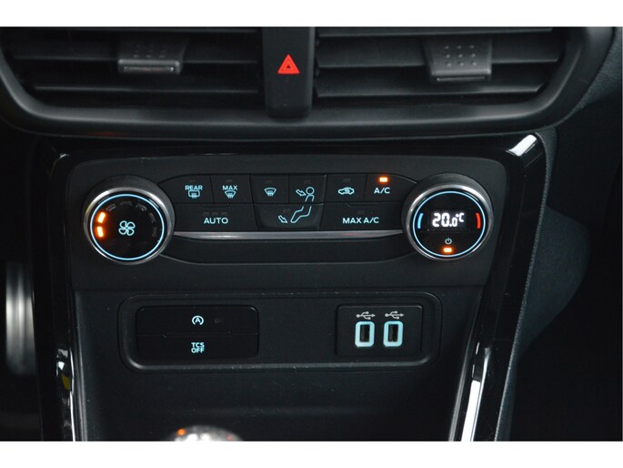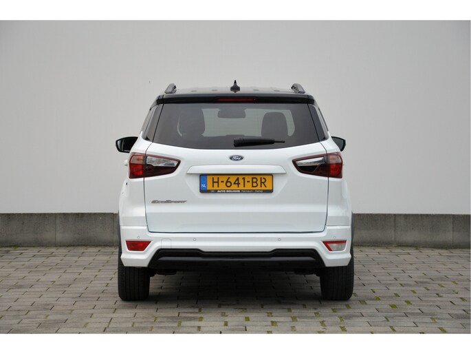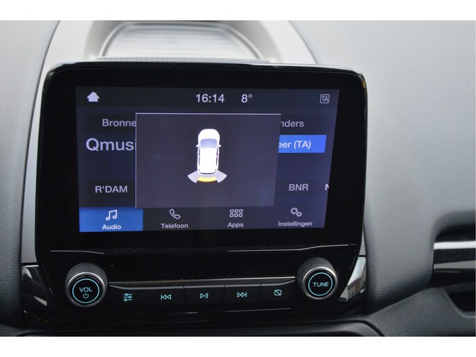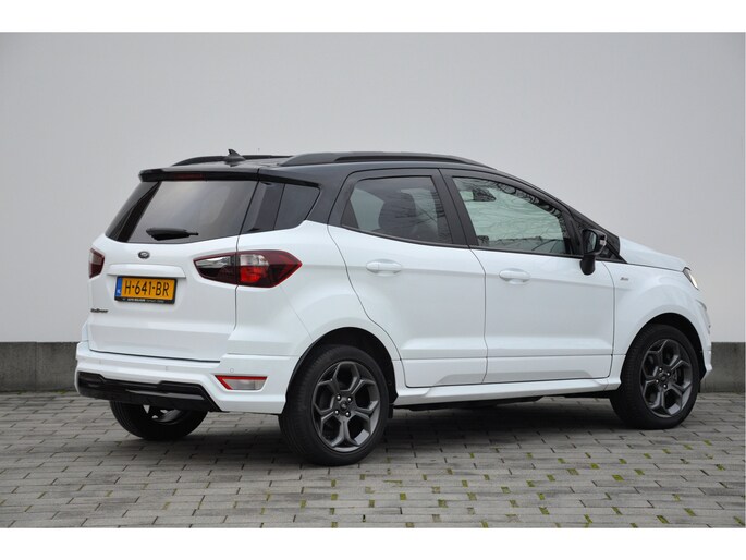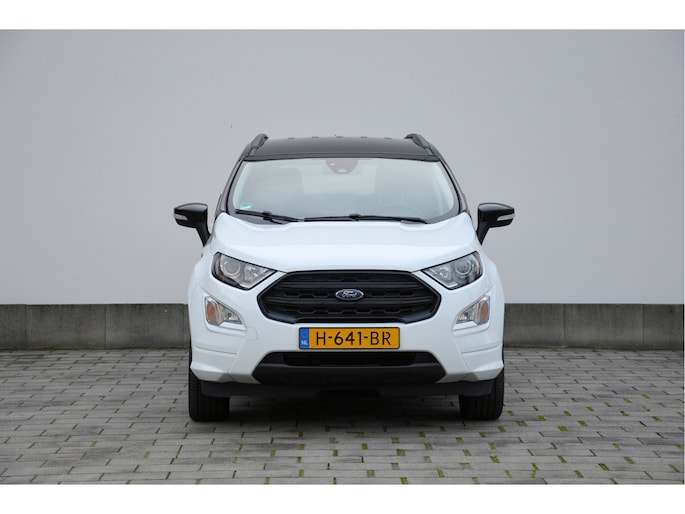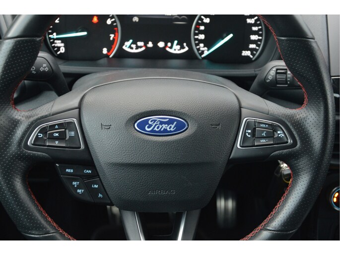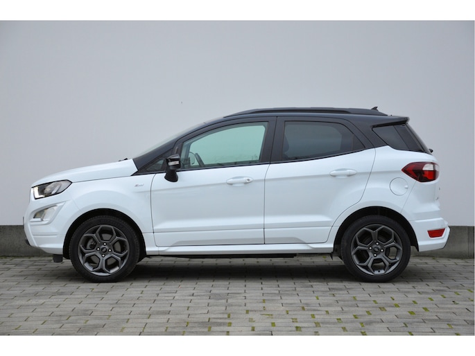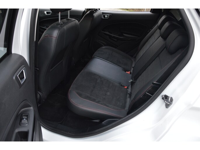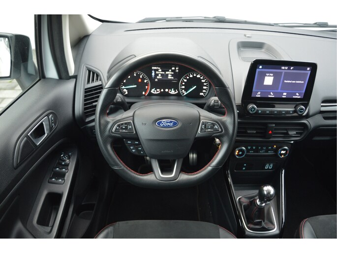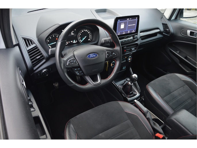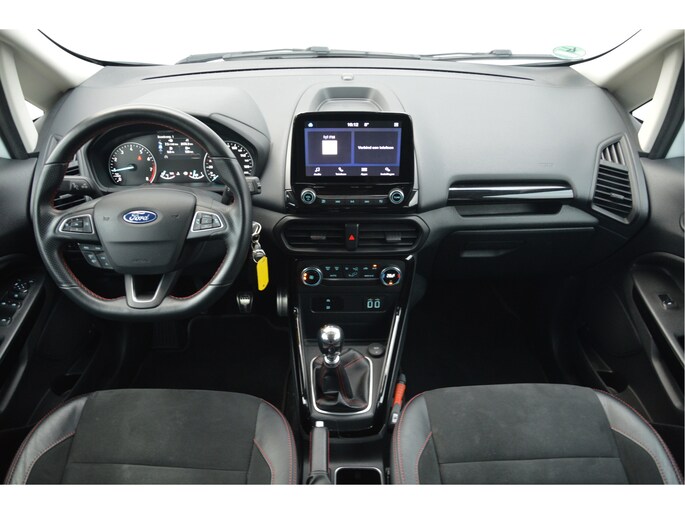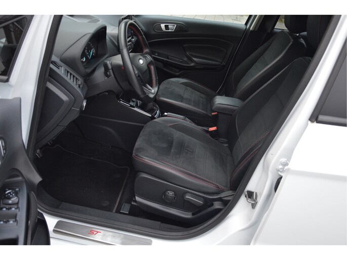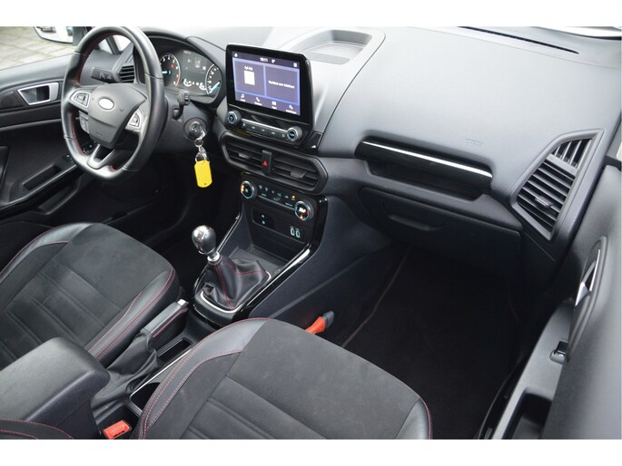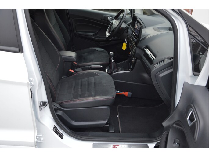 U zit lekker hoog en het instappen gaat erg gemakkelijk. Als ST-line uitvoering ziet de auto er zeer sportief uit. Speciale wielen, sportieve bumpers en het mooie contrast tussen het dak en de rest van de carrosserie laten zien dat dit geen standaard EcoSport is. Zitten doet u op fraaie sportstoelen met half leer en half alcantara. Het grote en duidelijk afleesbare touchsreen laat de navigatie, radio en bluetooth voor uw telefoon zien. Het is ook mogelijk om via Apple Carplay of Android Auto uw telefoon te koppelen. U kunt dan apps als Google Maps of Spotify op het touchscreen bedienen. Natuurlijk heeft deze luxe auto ook climate control en cruise control. U bent van harte welkom om dit te komen testen. We zetten de auto graag voor u klaar.
