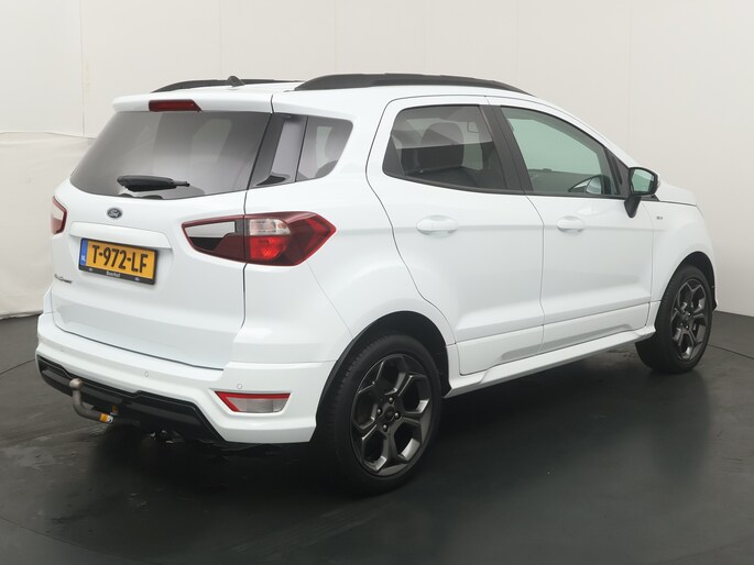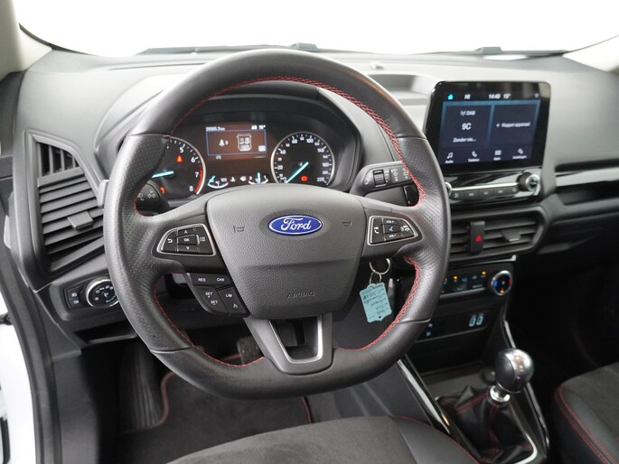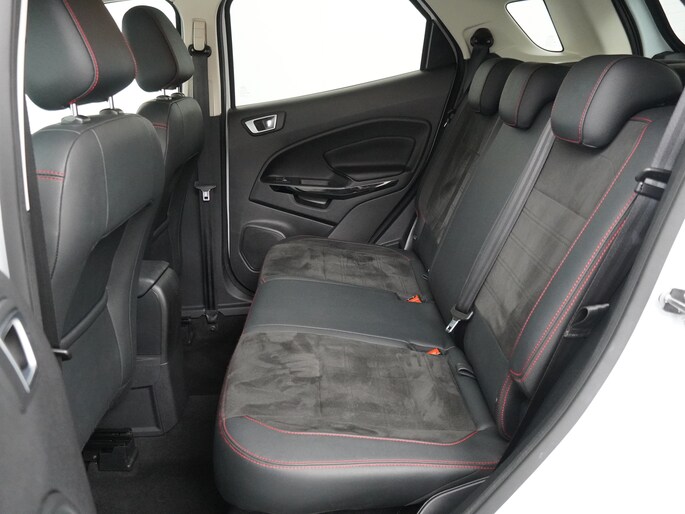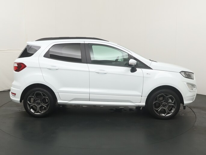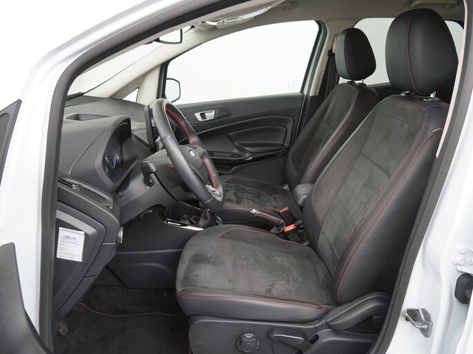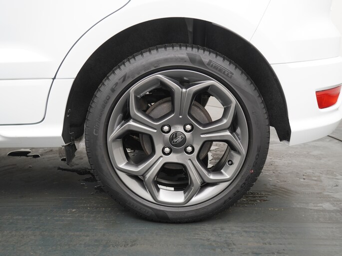 Deze EcoSport is uitgevoerd als ST-Line, en dat zie en voel je direct. De carrosserie is volledig meegespoten in kleur, wat de auto een strakke en sportieve uitstraling geeft. Daaronder staan fraaie sportieve lichtmetalen velgen die het geheel helemaal afmaken. Dit is geen standaard EcoSport, maar eentje met duidelijk meer uitstraling en karakter.