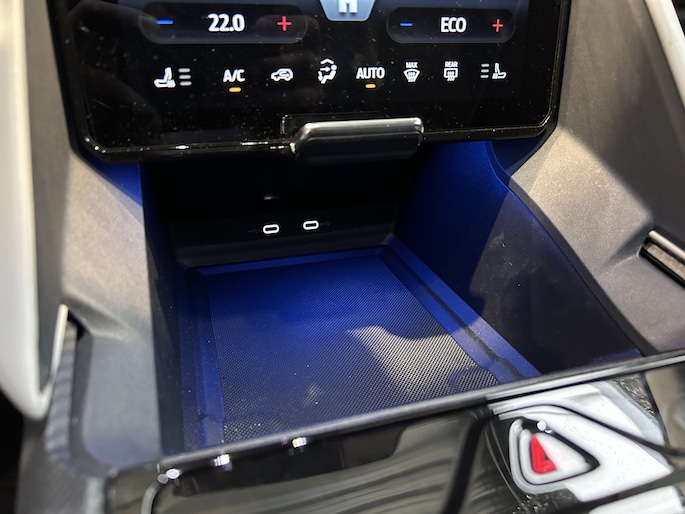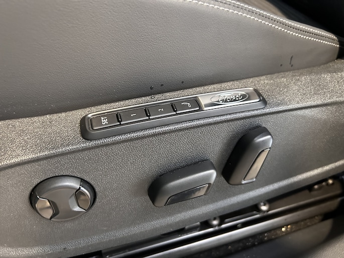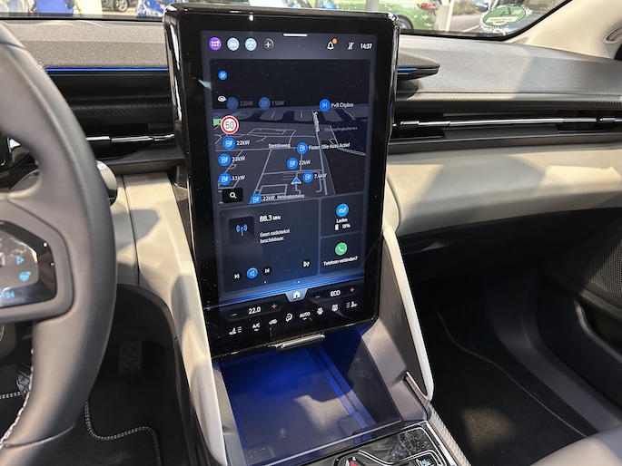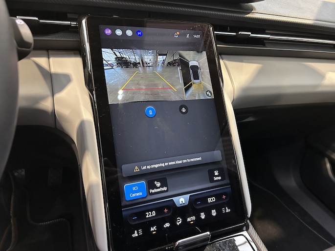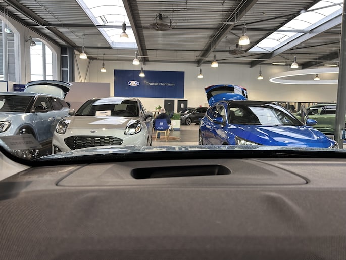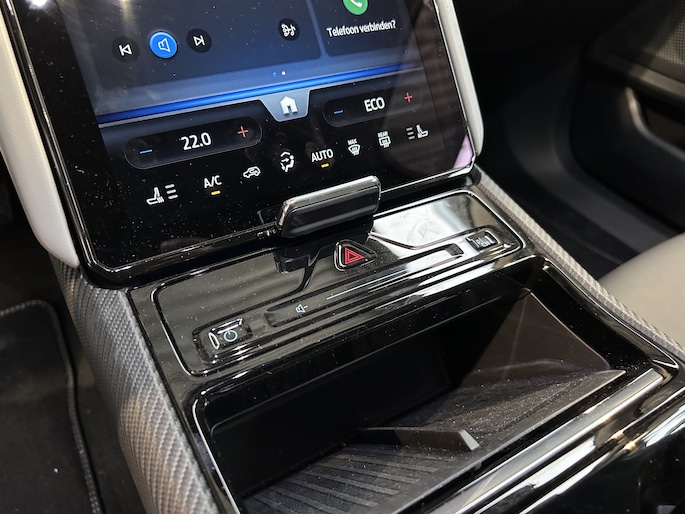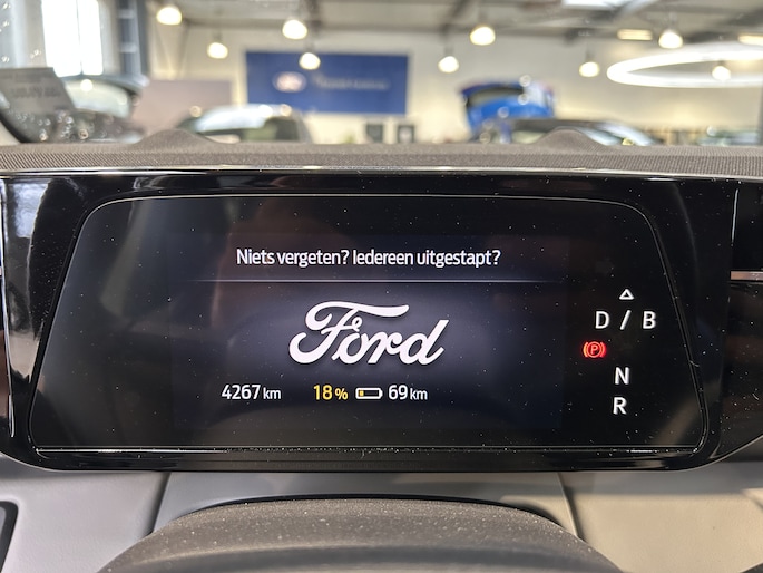 Centraal op het dashboard, onder handbereik ziet u het grote touchscreen. Naast navigatie en bluetooth is het ook mogelijk om via Apple Carplay of Android Auto uw telefoon te koppelen. U kunt dan apps als Google Maps of Spotify op het grote scherm bedienen. Zo hoeft u nooit meer de navigatiekaart te updaten en staat u nooit meer onnodig lang in de file door zeer nauwkeurige verkeersinformatie. Het koppelen gaat draadloos zodat u de telefoon niet meer uit uw broekzak of jaszak hoeft te halen. Uw telefoon kunt u in het vak voor het touchscreen leggen zodat hij wordt opgeladen. Het scherm is bovendien te schuiven. In de achterste stand ligt het gelijk met het dashboard. In de voorste stand staat het scherm rechtop en steekt het boven het dashboard uit. Zo kunt u zelf bepalen wat voor u een fijne positie is. Achter het scherm is een verborgen ruimte die Ford de my private locker noemt. Een opbergruimte die in de achterste stand is afgesloten en is voorzien van 2 USB-C aansluitingen. Ook in de tunnelconsole is een groot afsluitbaar vak. Het is groot genoeg om een compacte laptop in de bewaren.