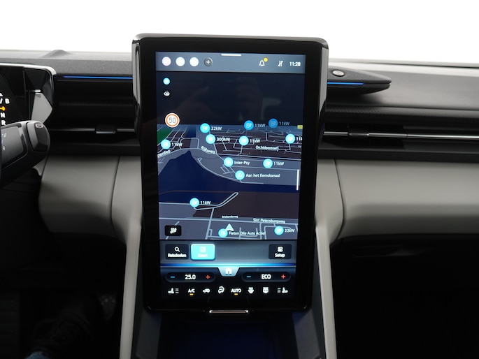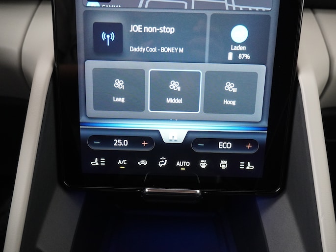 Centraal op het dashboard, onder handbereik ziet u het grote touchscreen. Naast navigatie en bluetooth is het ook mogelijk om via Apple Carplay of Android Auto uw telefoon te koppelen. U kunt dan apps als Google Maps of Spotify op het grote scherm bedienen. Zo hoeft u nooit meer de navigatiekaart te updaten en staat u nooit meer onnodig lang in de file door zeer nauwkeurige verkeersinformatie. Het koppelen gaat draadloos zodat u de telefoon niet meer uit uw broekzak of jaszak hoeft te halen. Uw telefoon kunt u in het vak voor het touchscreen leggen zodat hij wordt opgeladen. Het scherm is bovendien te schuiven. In de achterste stand ligt het gelijk met het dashboard. In de voorste stand staat het scherm rechtop en steekt het boven het dashboard uit. Zo kunt u zelf bepalen wat voor u een fijne positie is. Achter het scherm is een verborgen ruimte die Ford de my private locker noemt. Een opbergruimte die in de achterste stand is afgesloten en is voorzien van 2 USB-C aansluitingen. Ook in de tunnelconsole is een groot afsluitbaar vak. Het is groot genoeg om een compacte laptop in de bewaren. Het geluid komt van een audio-installatie van Bang&Olufsen. Met de subwoofer, versterker en surround speaker kunt u genieten van een fantastisch geluid!