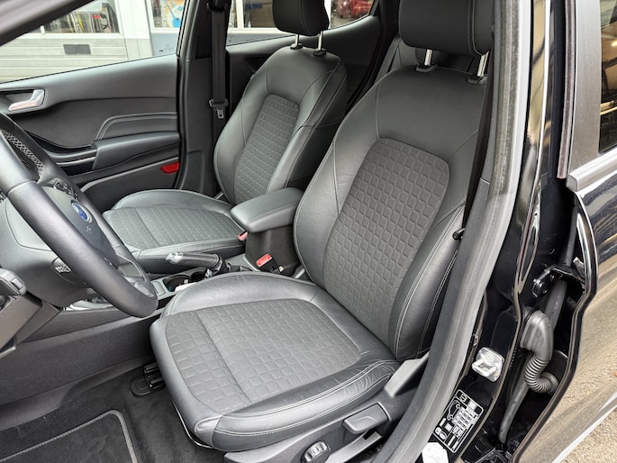 De nieuwste veiligheidssystemen komen in deze Ford Fiesta samen. Het Lane-keeping systeem zorgt voor een automatisch constante positie binnen de rijstrook. Afdwalen is uitgesloten. Veel aanrijdingen bestaan uit kop-staartbotsingen. De forward collision warning reduceert dat risico aanzienlijk. De auto is ook uitgerust met dodehoekdetectie, hill hold functie, brake assist en bandenspanningcontrolesysteem.