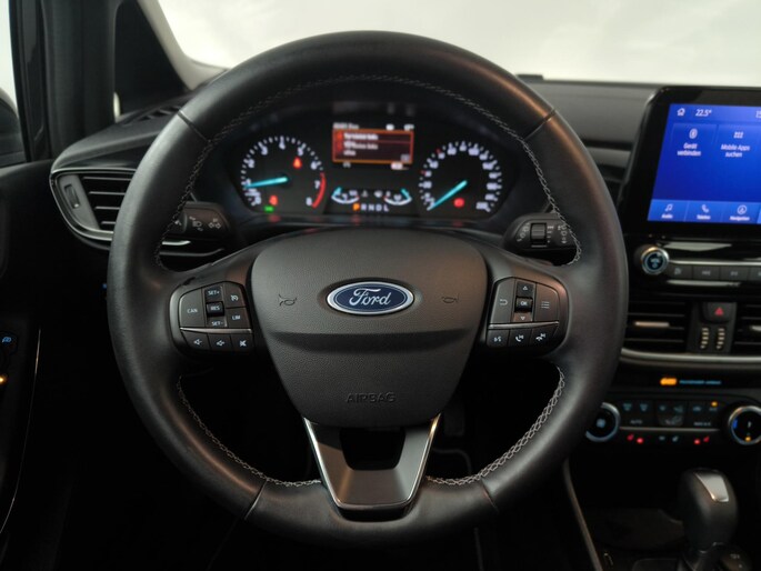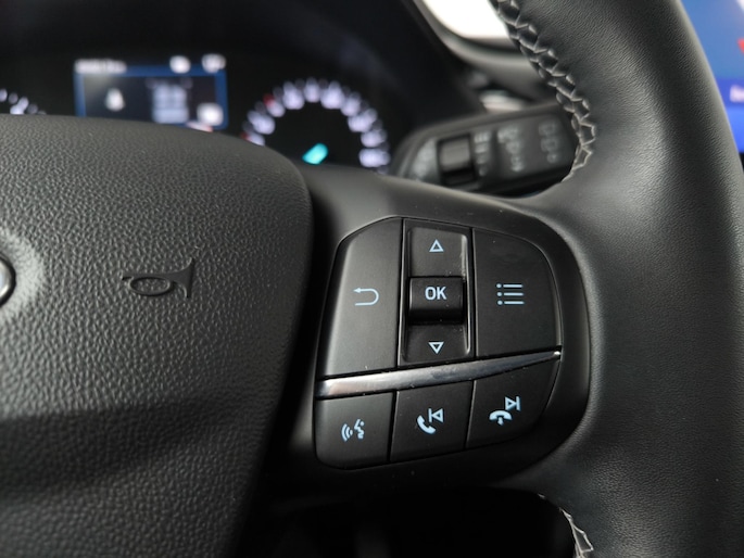 Zodra u naar de 'R' schakelt, gaat de achteruitrijcamera in werking en heeft u een perfect zicht op alles wat zich achter de auto afspeelt. Vergeten af te sluiten? Bandenspanning onvoldoende? De speciale app geeft u direct een seintje met behulp van Connected Services. Het audiosysteem met DAB-ontvangst en het full map navigatiesysteem bedient u veilig met knoppen op het stuurwiel of met gesproken commando's. Automatische airconditioning regelt volautomatisch de temperatuur. U kiest de gewenste temperatuur en het systeem doet de rest. Het drukke verkeer eist onderweg al uw aandacht op. Daarom is het goed dat deze Ford is voorzien van diverse systemen die u assisteren tijdens de rit. Een automatisch inschakelbare verlichting neemt het waar als het donker wordt of gaat schemeren, en schakelt dan automatisch de verlichting in. Op dezelfde manier "ziet" de regensensor de eerste spatjes regen en schakelt dan de ruitenwissers in, en als het harder gaat regenen zet hij de ruitenwissers ook in een snellere stand. En deze auto heeft ook cruise control, keyless entry, automatisch dimmende binnenspiegel, boordcomputer en verstelbaar stuur als standaard uitrusting.
