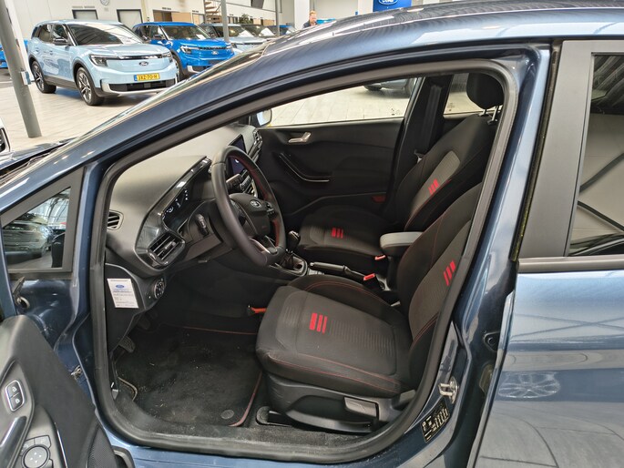 De Ford Fiesta van het laatste type! Al jaren lang de best sturende auto in zijn klasse. De ST-Line uitvoering is de sportieve tak van de familie. Een subtiel verlaagd onderstel, speciale bumpers, sideskirts en velgen geven de auto een heel andere uitstraling. Ook vering en demping is aangepast waardoor de wegligging nog beter is dan de standaard Focus. Ook van binnen ziet de auto er sportiever uit. Zwarte hemelbekleding en rode stiksels geven ook het interieur een sportieve uitstraling. De EcoBoost Hybrid motor met 125 pk past uitstekend bij het karakter van de auto. De mild-hybride technologie omvat een elektromotor die helpt de efficiency te verbeteren. Bij een mild-hibride auto biedt de elektromotor indien nodig aanvullende ondersteuning aan de benzinemotor om de actieradius te vergroten en de emissiewaarden te verlagen. Het is niet nodig om mHEV-auto's op te laden. Tijdens het afremmen wordt de hybride-accu geladen met energie die anders verloren was gegaan bij het remmen. Bij het optrekken wordt deze teruggewonnen energie weer gebruikt. De elektromotor levert ongeveer 12 pk om het accelereren zuiniger te maken. De elektromotor levert zijn kracht al vanaf 0 toeren. Het maakt dat de motor nog beter oppakt bij lage toerentallen en nog fijner op het gaspedaal reageert. Met deze techniek wordt vooral bij wisselend verkeer met remmen en optrekken een forse besparing gerealiseerd. Door het lage gewicht van het mild-hybride systeem is de wegenbelasting nauwelijks hoger dan bij een gewone benzine en blijft het sportieve karakter van de auto behouden.