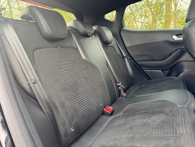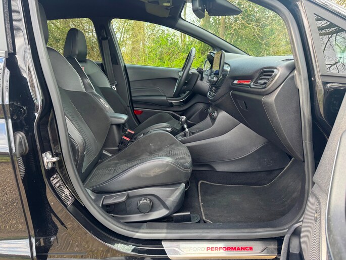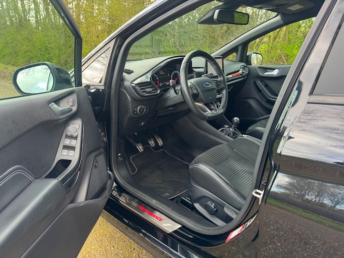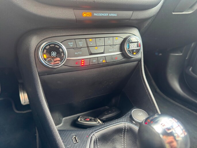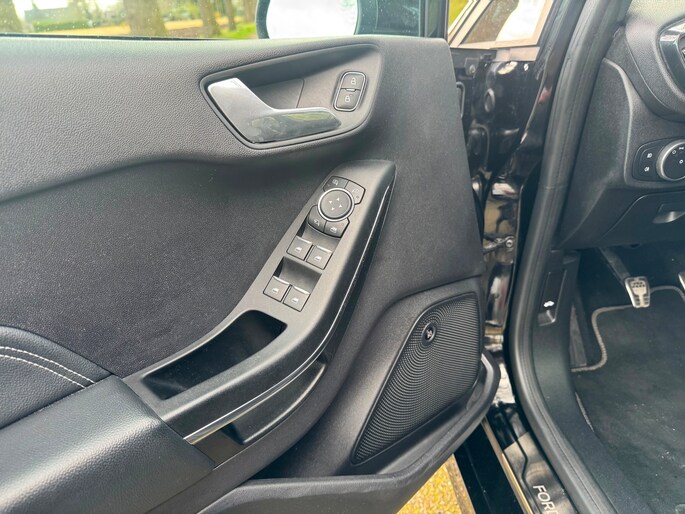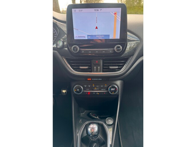 Zoals u mag verwachten van deze Ford Fiesta is hij uitgerust met een reeks aan actieve veiligheidssystemen. Belangrijk voor uw veiligheid en die van uw passagiers is de verkeersbord-detectie in deze auto. Het Lane-keeping systeem let constant op en waarschuwt of corrigeert als u onoplettend over de lijnen van de rijstrook gaat. Het systeem voor vermoeidheidsherkenning neemt het waar als uw concentratie verslapt en geeft u dan een waarschuwing. Ook helpen het hill hold functie, brake assist en bandenspanningcontrolesysteem, uw rit tot een veilige rit te maken.