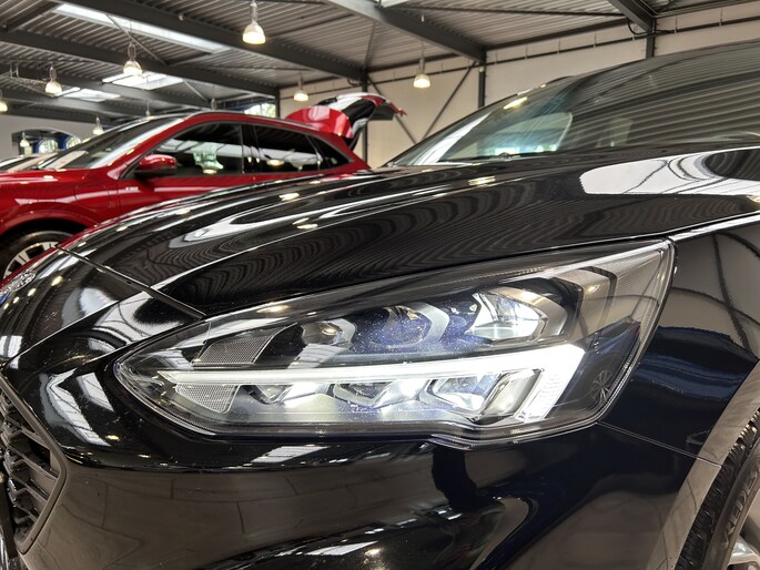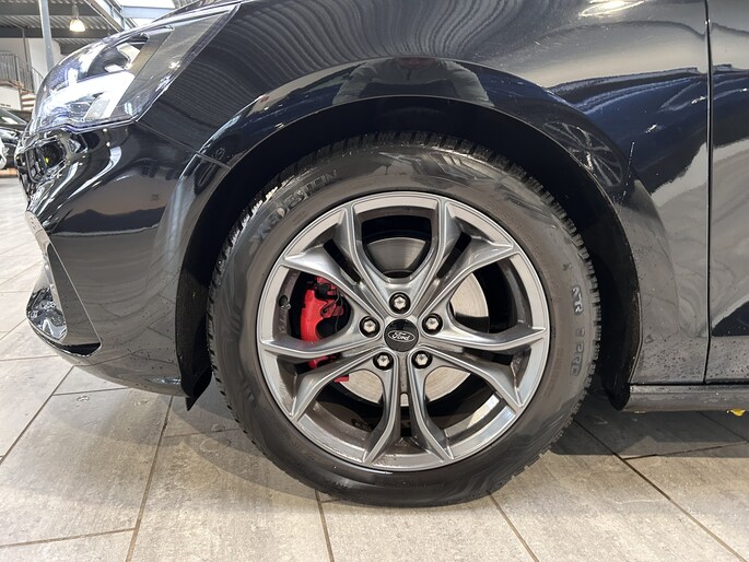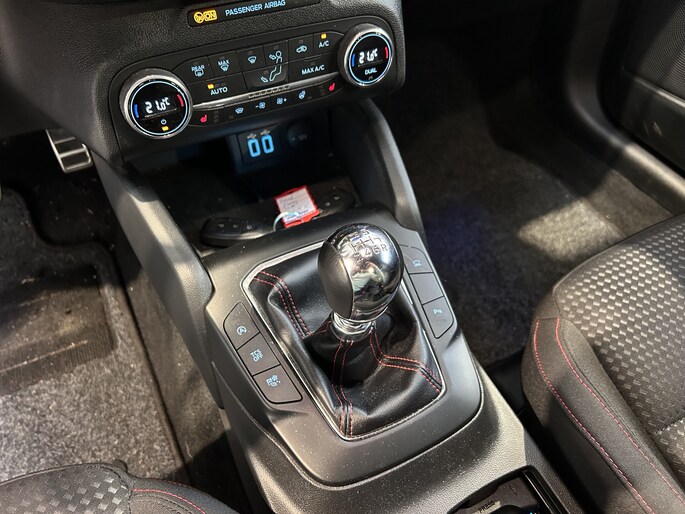 De Ford Focus wordt alom geroemd om zijn uitstekende rijeigenschappen. Zeker als ST-Line is het wegligging zeer goed. De auto is sportief, zonder oncomfortabel te worden. De besturing is zeer precies en typisch Ford. Naast het fantastische onderstel, heeft de ST-line uitvoering sportieve looks. De auto is vanaf de fabriek 1 cm verlaagd. De sportieve voor- en achterbumper, sideskirts en fraaie 17" lichtmetalen velgen laten zien dat dit geen standaard uitvoering is. De full LED koplampen geven met de fraaie LED dagrijverlichting extra uitstraling aan de voorzijde. In het donker is de lichtopbrengst geweldig. De lichtsensor regelt automatisch het in- en uitschakelen van het grootlicht zodat u optimaal zicht heeft zonder tegenliggers te verblinden. Ook van binnen onderscheid de Focus zich van de andere uitvoeringen. De bestuurder en passagier zitten op fraaie sportstoelen die zijn afgewerkt met een rood stiksel. Dat stiksel zien we ook terug op het stuur en rond de versnellingspook. De hemelbekleding is zwart.