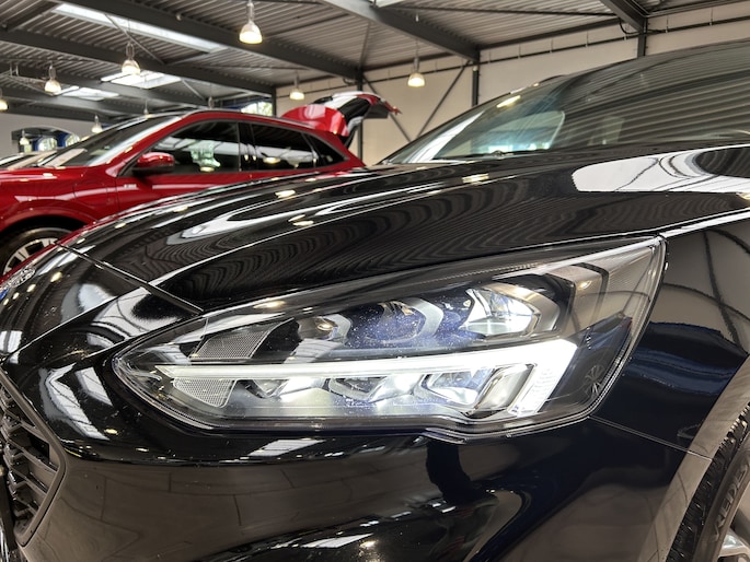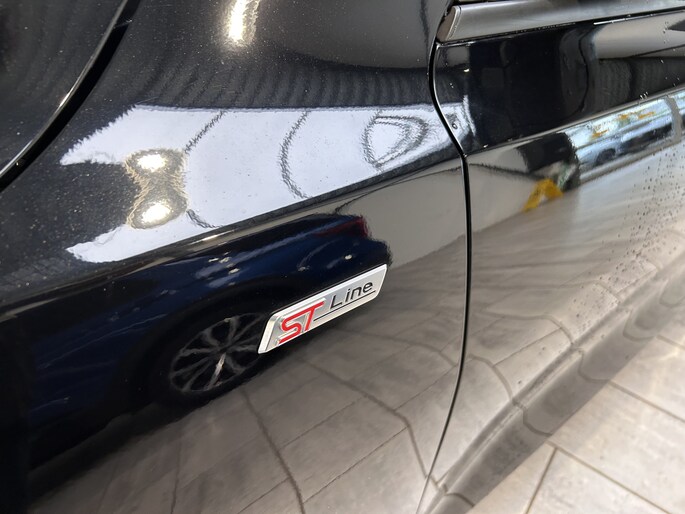De Ford Focus wordt alom geroemd om zijn uitstekende rijeigenschappen. Zeker als ST-Line is het wegligging zeer goed. De auto is sportief, zonder oncomfortabel te worden. De besturing is zeer precies en typisch Ford. Naast het fantastische onderstel, heeft de ST-line uitvoering sportieve looks. De auto is vanaf de fabriek 1 cm verlaagd. De sportieve voor- en achterbumper, sideskirts en fraaie 17" lichtmetalen velgen laten zien dat dit geen standaard uitvoering is. De full LED koplampen geven met de fraaie LED dagrijverlichting extra uitstraling aan de voorzijde. In het donker is de lichtopbrengst geweldig. De lichtsensor regelt automatisch het in- en uitschakelen van het grootlicht zodat u optimaal zicht heeft zonder tegenliggers te verblinden. Ook van binnen onderscheid de Focus zich van de andere uitvoeringen. De bestuurder en passagier zitten op fraaie sportstoelen die zijn afgewerkt met een rood stiksel. Dat stiksel zien we ook terug op het stuur en rond de versnellingspook. De hemelbekleding is zwart.